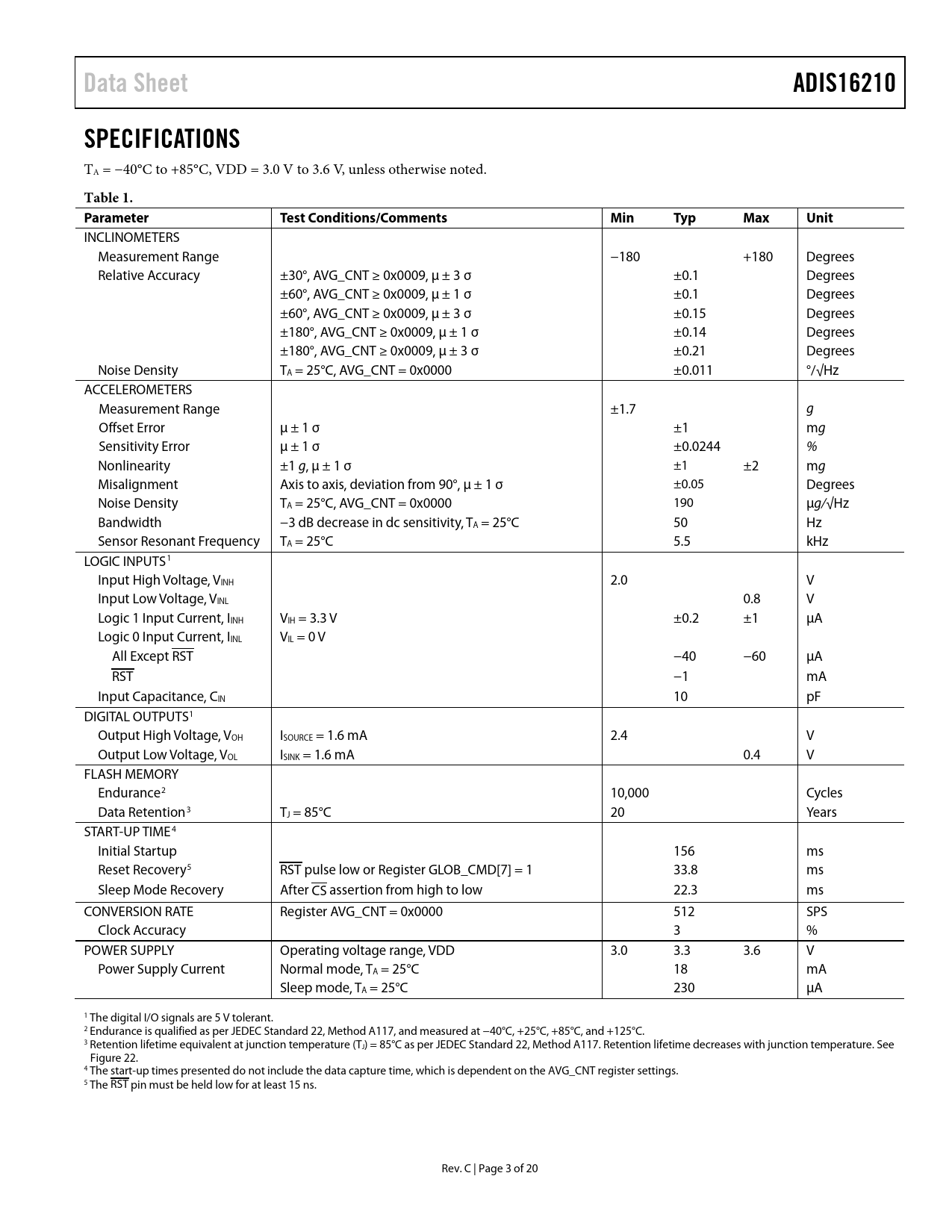 Data Sheet ADIS16210 SPECIFICATIONS Table 1 Parameter Test Conditions/Comments Min Typ Max Unit