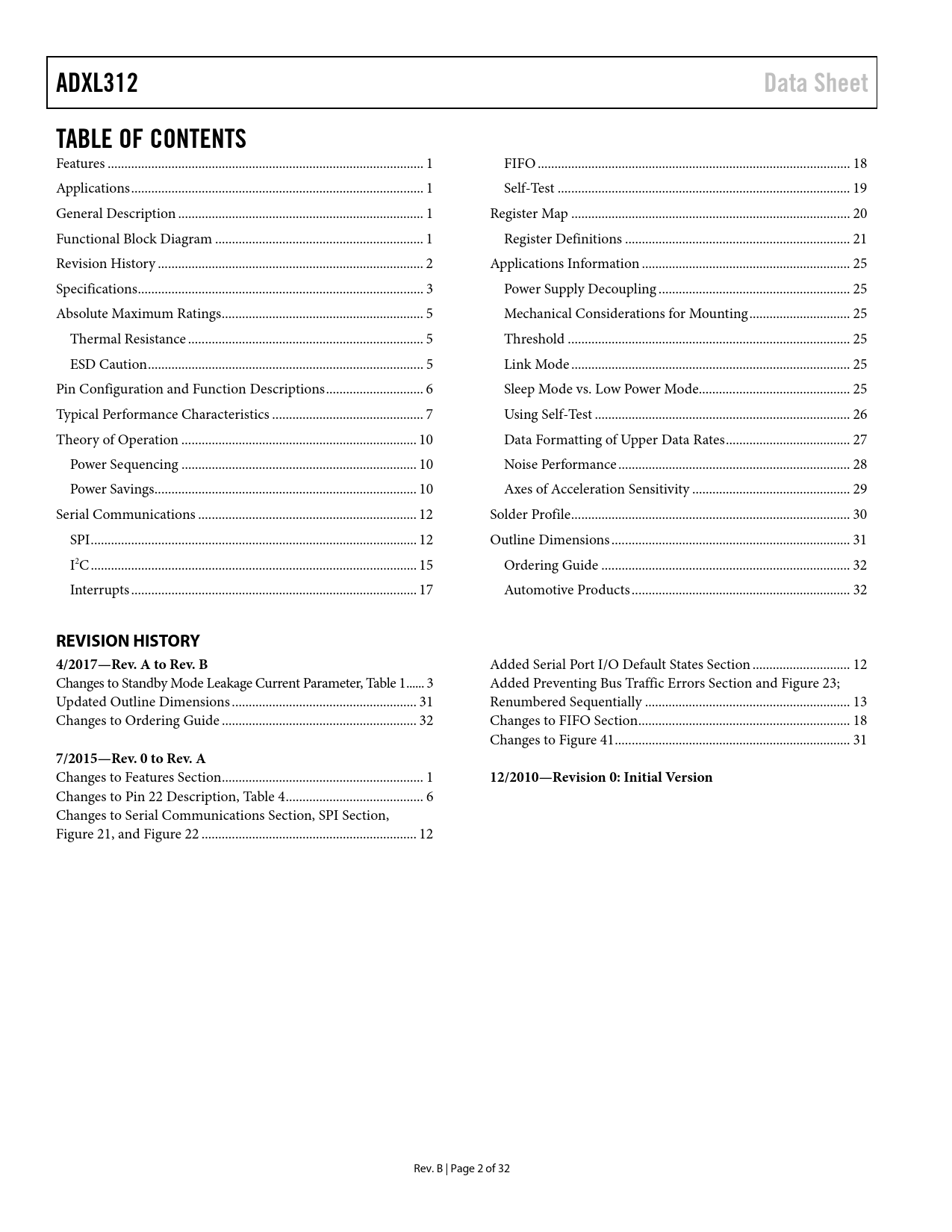 link to page 1 link to page 1 link to page 1 link to page 1 link to page 3 link to page 4 link to page 6 link to page 6 link to page 6 link to page 7 link to page 8 link to page 11 link to page 11 link to page 11 link to page 13 link to page 13 link to page 16 link to page 18 link to page 19 link to page 20 link to page 22 link to page 26 link to page 26 link to page 26 link to page 26 link to page 26 link to page 26 link to page 27 link to page 28 link to page 29 link to page 30 link to page 31 link to page 33 link to page 33 ADXL312Data SheetTABLE OF CONTENTS Features .. 1 FIFO ... 18 Applications ... 1 Self-Test ... 19 General Description ... 1 Register Map ... 20 Functional Block Diagram .. 1 Register Definitions ... 21 Revision History ... 2 Applications Information .. 25 Specifications ... 3 Power Supply Decoupling ... 25 Absolute Maximum Ratings .. 5 Mechanical Considerations for Mounting .. 25 Thermal Resistance .. 5 Threshold .. 25 ESD Caution .. 5 Link Mode ... 25 Pin Configuration and Function Descriptions ... 6 Sleep Mode vs. Low Power Mode... 25 Typical Performance Characteristics ... 7 Using Self-Test .. 26 Theory of Operation .. 10 Data Formatting of Upper Data Rates ... 27 Power Sequencing .. 10 Noise Performance ... 28 Power Savings.. 10 Axes of Acceleration Sensitivity ... 29 Serial Communications ... 12 Solder Profile ... 30 SPI ... 12 Outline Dimensions ... 31 I2C ... 15 Ordering Guide .. 32 Interrupts ... 17 Automotive Products ... 32 REVISION HISTORY 4/2017—Rev. A to Rev. B Added Serial Port I/O Default States Section ... 12 Changes to Standby Mode Leakage Current Parameter, Table 1 . ... 3 Added Preventing Bus Traffic Errors Section and Figure 23; Updated Outline Dimensions ... 31 Renumbered Sequential y ... 13 Changes to Ordering Guide .. 32 Changes to FIFO Section ... 18 Changes to Figure 41 .. 31 7/2015—Rev. 0 to Rev. A Changes to Features Section.. 1 12/2010—Revision 0: Initial Version Changes to Pin 22 Description, Table 4 ... 6 Changes to Serial Communications Section, SPI Section, Figure 21, and Figure 22 .. 12 Rev. B | Page 2 of 32 Document Outline Features Applications General Description Functional Block Diagram Revision History Specifications Absolute Maximum Ratings Thermal Resistance ESD Caution Pin Configuration and Function Descriptions Typical Performance Characteristics Theory of Operation Power Sequencing Power Savings Power Modes Autosleep Mode Standby Mode Serial Communications Serial Port I/O Default states SPI Preventing Bus Traffic Errors I2C Interrupts DATA_READY Activity Inactivity Watermark Overrun FIFO Bypass Mode FIFO Mode Stream Mode Trigger Mode Retrieving Data from FIFO Self-Test Register Map Register Definitions Register 0x00—DEVID (Read Only) Register 0x1E, Register 0x1F, Register 0x20—OFSX, OFSY, OFSZ (Read/Write) Register 0x24—THRESH_ACT (Read/Write) Register 0x25—THRESH_INACT (Read/Write) Register 0x26—TIME_INACT (Read/Write) Register 0x27—ACT_INACT_CTL (Read/Write) ACT AC/DC and INACT AC/DC Bits ACT_x Enable Bits and INACT_x Enable Bits Register 0x2C—BW_RATE (Read/Write) LOW_POWER Bit Rate Bits Register 0x2D—POWER_CTL (Read/Write) Link Bit AUTO_SLEEP Bit Measure Bit Sleep Bit Wake-Up Bits Register 0x2E—INT_ENABLE (Read/Write) Register 0x2F—INT_MAP (Read/Write) Register 0x30—INT_SOURCE (Read Only) Register 0x31—DATA_FORMAT (Read/Write) SELF_TEST Bit SPI Bit INT_INVERT Bit FULL_RES Bit Justify Bit Range Bits Register 0x32 to Register 0x37—DATAX0, DATAX1, DATAY0, DATAY1, DATAZ0, DATAZ1 (Read Only) Register 0x38—FIFO_CTL (Read/Write) FIFO_MODE Bits Trigger Bit Samples Bits 0x39—FIFO_STATUS (Read Only) FIFO_TRIG Bit Entries Bits Applications Information Power Supply Decoupling Mechanical Considerations for Mounting Threshold Link Mode Sleep Mode vs. Low Power Mode Using Self-Test Data Formatting of Upper Data Rates Noise Performance Axes of Acceleration Sensitivity Solder Profile Outline Dimensions Ordering Guide Automotive Products