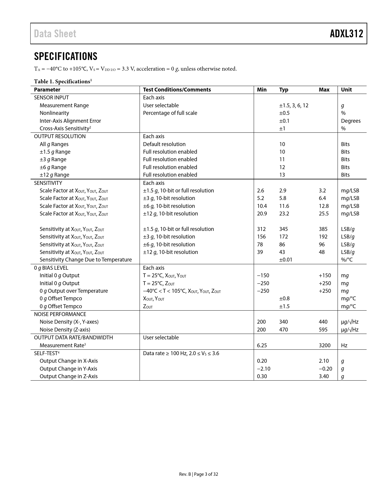 Data Sheet. ADXL312. SPECIFICATIONS. Table 1. Specifications1. Parameter. Test Conditions/Comments. Min. Typ. Max. Unit