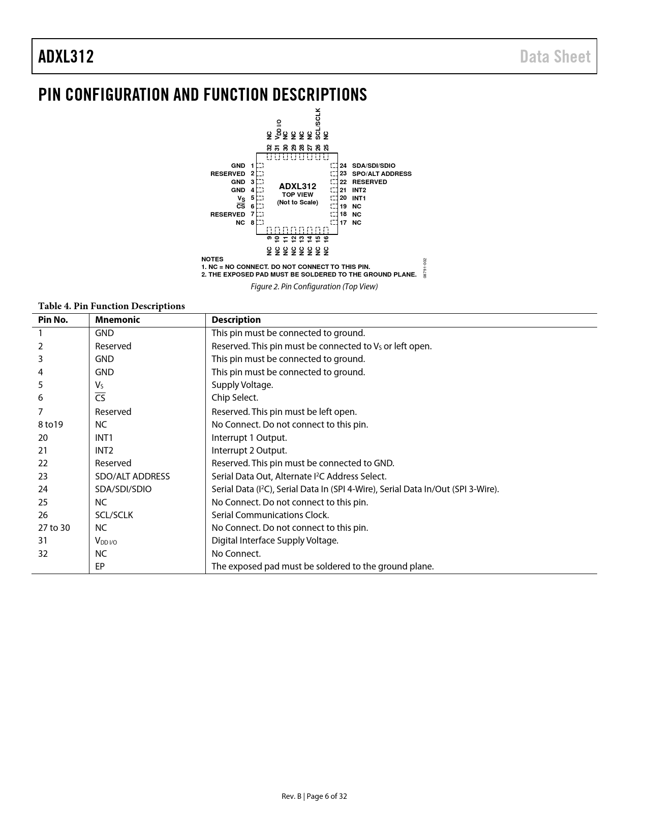 ADXL312 Data Sheet PIN CONFIGURATION AND FUNCTION DESCRIPTIONS K L I/O /SC D L D NC V NC NC NC NC SC NC 32 31 30 29 28 27 26 25 GND 1 24 SDA/SDI/SDIO RESERVED 2 23 SPO/ALT ADDRESS GND 3 22 RESERVED ADXL312 GND 4 21 INT2 TOP VIEW V 5 20 INT1 S (Not to Scale) CS 6 19 NC RESERVED 7 18 NC NC 8 17 NC 9 10 11 12 13 14 15 16 NC NC NC NC NC NC NC NC NOTES