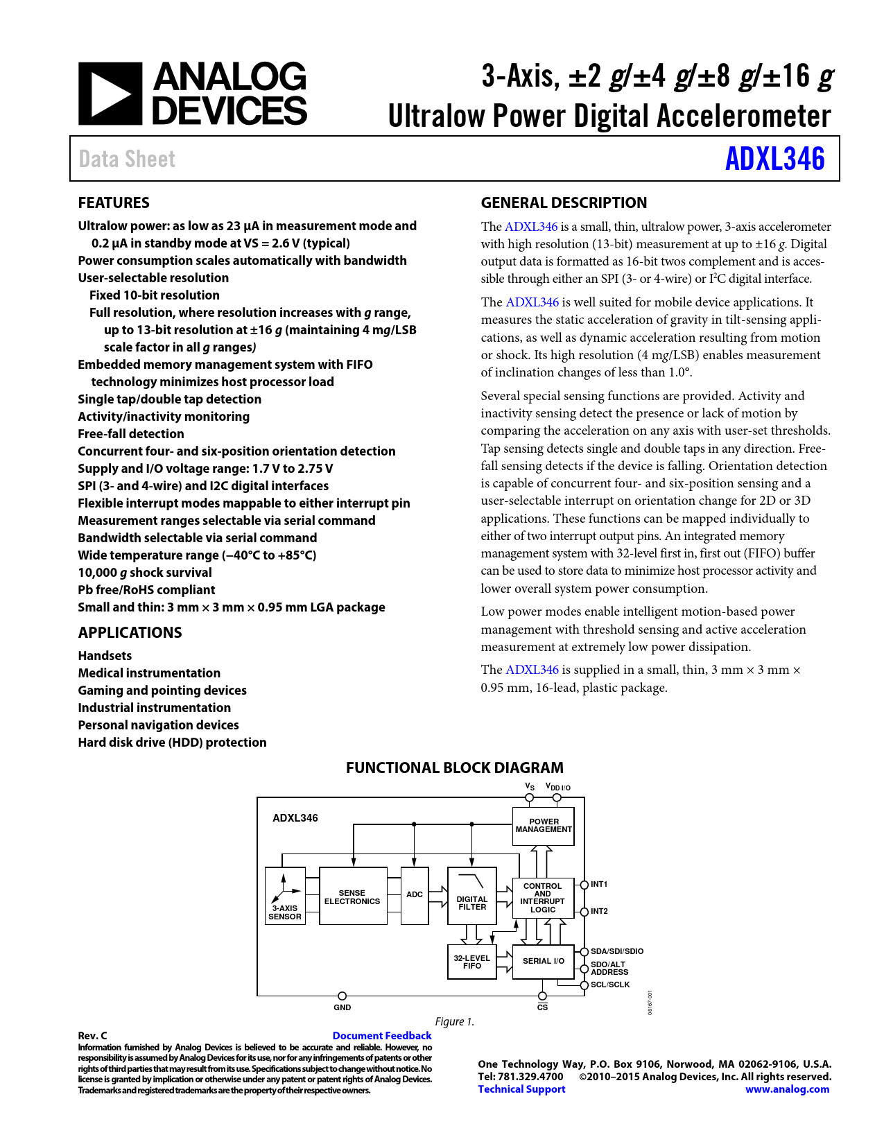 Industrial instrumentation Personal navigation devices Hard disk drive (HDD) protection FUNCTIONAL BLOCK DIAGRAM VS VDD I/O ADXL346 POWER MANAGEMENT CONTROL INT1 SENSE ADC AND ELECTRONICS DIGITAL INTERRUPT 3-AXIS FILTER LOGIC INT2 SENSOR SDA/SDI/SDIO 32-LEVEL SERIAL I/O FIFO SDO/ALT ADDRESS SCL/SCLK