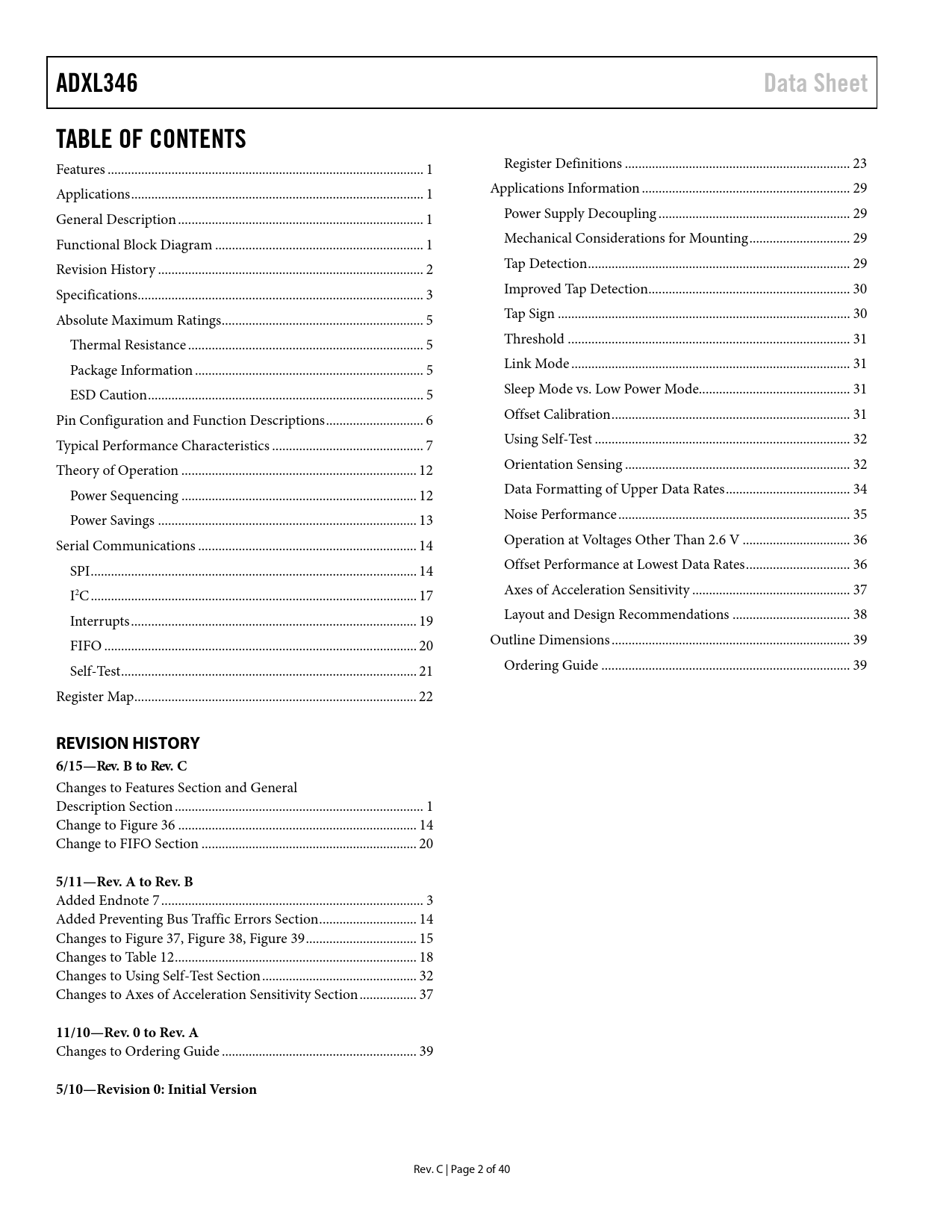 ADXL346 Data Sheet TABLE OF CONTENTS REVISION HISTORY 6/15—Rev B to Rev C 5/11—Rev A to Rev B 11/10—Rev 0 to Rev A
