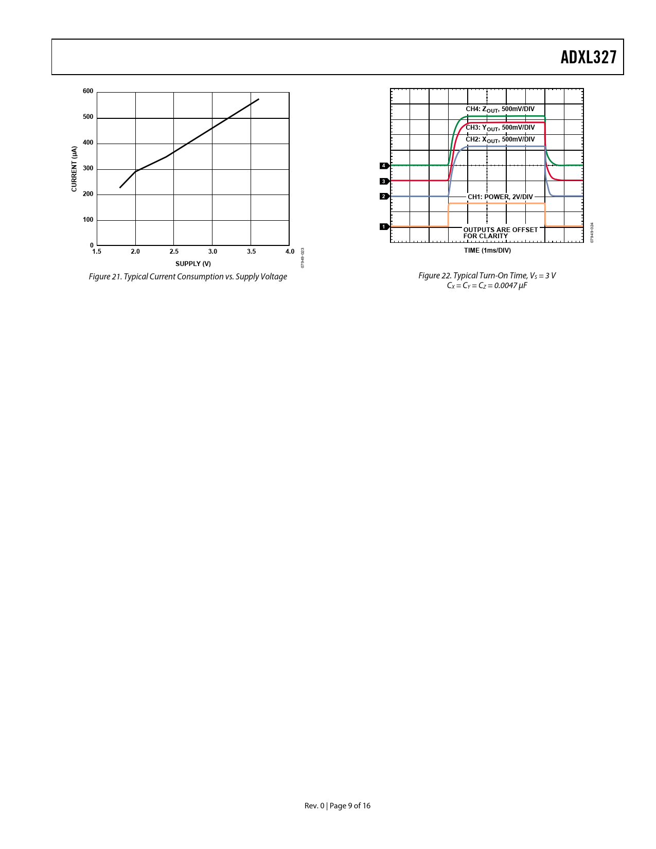 ADXL327 600 CH4: ZOUT, 500mV/DIV 500 CH3: YOUT, 500mV/DIV 400 CH2: XOUT, 500mV/DIV A) µ ( NT 300 RRE CU 200 CH1: POWER, 2V/DIV 100