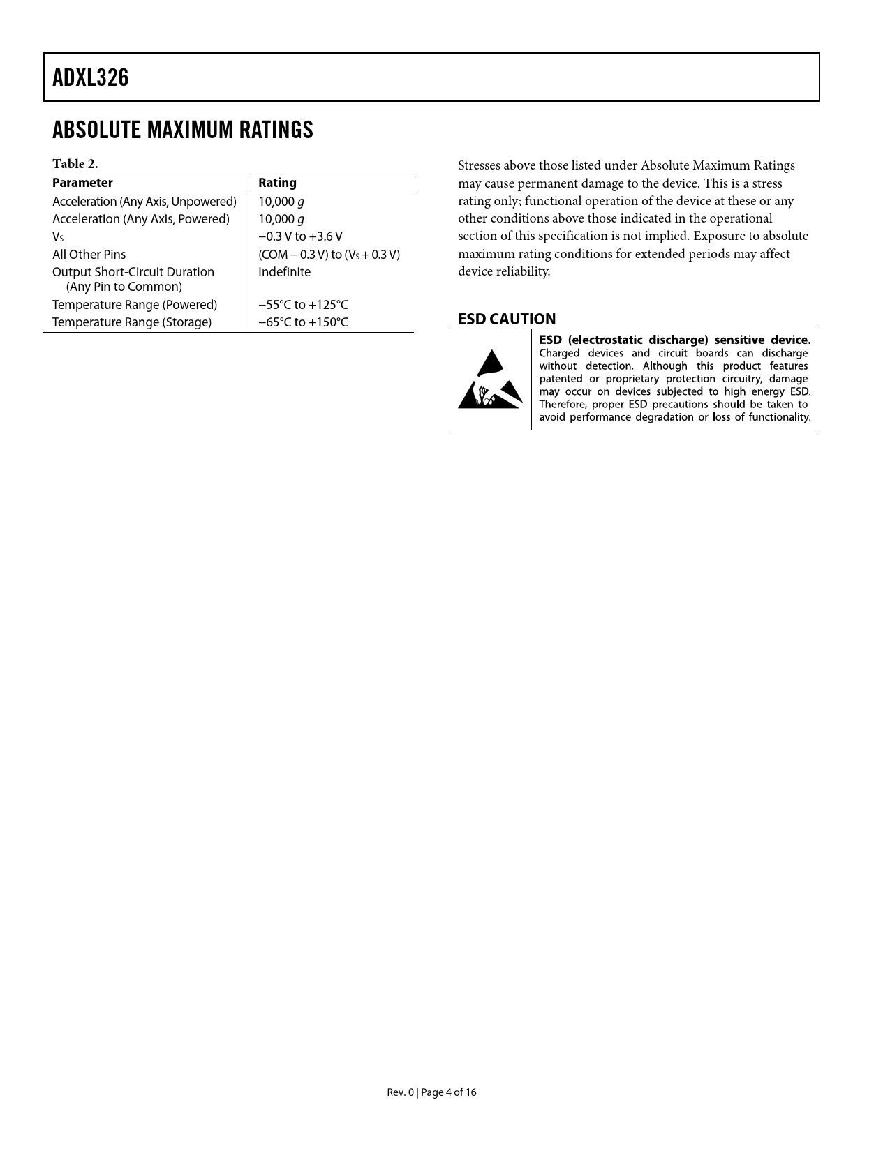 ADXL326ABSOLUTE MAXIMUM RATINGSTable 2. Stresses above those listed under Absolute Maximum Ratings Parameter Rating may cause permanent damage to the device. This is a stress Acceleration (Any Axis, Unpowered) 10,000 g rating only; functional operation of the device at these or any Acceleration (Any Axis, Powered) 10,000 g other conditions above those indicated in the operational VS −0.3 V to +3.6 V section of this specification is not implied. Exposure to absolute All Other Pins (COM − 0.3 V) to (VS + 0.3 V) maximum rating conditions for extended periods may affect Output Short-Circuit Duration Indefinite device reliability. (Any Pin to Common) Temperature Range (Powered) −55°C to +125°C Temperature Range (Storage) −65°C to +150°C ESD CAUTION Rev. 0 | Page 4 of 16 Document Outline FEATURES APPLICATIONS GENERAL DESCRIPTION FUNCTIONAL BLOCK DIAGRAM TABLE OF CONTENTS REVISION HISTORY SPECIFICATIONS ABSOLUTE MAXIMUM RATINGS ESD CAUTION PIN CONFIGURATION AND FUNCTION DESCRIPTIONS TYPICAL PERFORMANCE CHARACTERISTICS THEORY OF OPERATION MECHANICAL SENSOR PERFORMANCE APPLICATIONS INFORMATION POWER SUPPLY DECOUPLING SETTING THE BANDWIDTH USING CX, CY, AND CZ SELF TEST DESIGN TRADE-OFFS FOR SELECTING FILTER CHARACTERISTICS: THE NOISE/BW TRADE-OFF USE WITH OPERATING VOLTAGES OTHER THAN 3 V AXES OF ACCELERATION SENSITIVITY LAYOUT AND DESIGN RECOMMENDATIONS OUTLINE DIMENSIONS ORDERING GUIDE