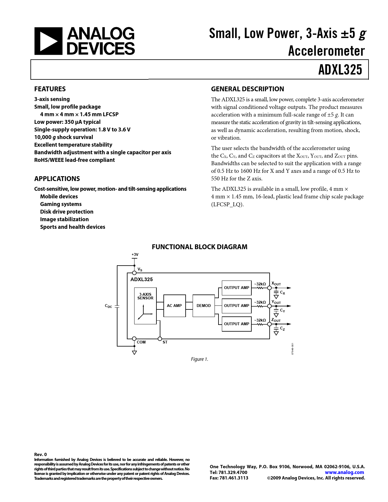 Small, Low Power, 3-Axis ±5 g. Accelerometer. ADXL325. FEATURES. GENERAL DESCRIPTION. 3-axis sensing. Small, low profile package