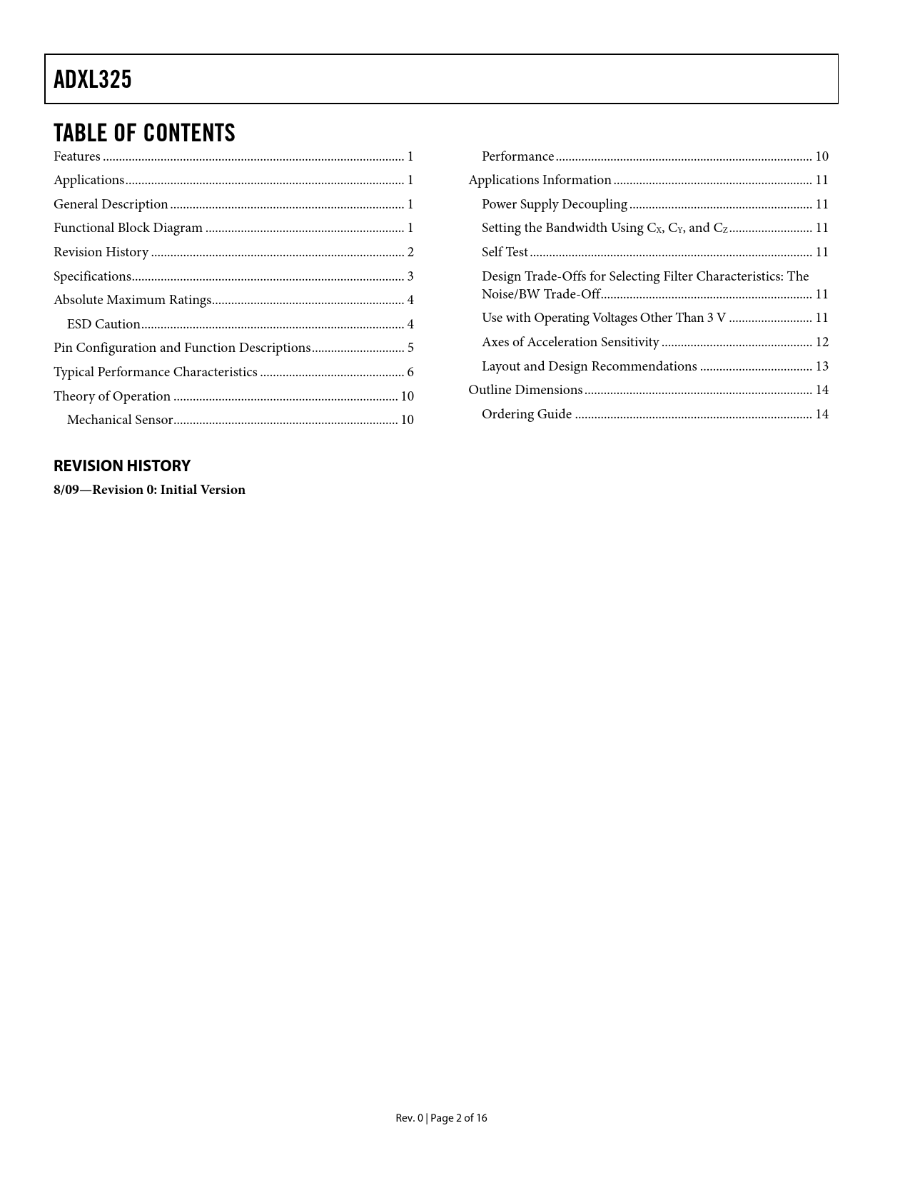 Seiten / Seite17 / 3 — ADXL325. TABLE OF CONTENTS. REVISION HISTORY. 8/09—Revision 0: Initial …