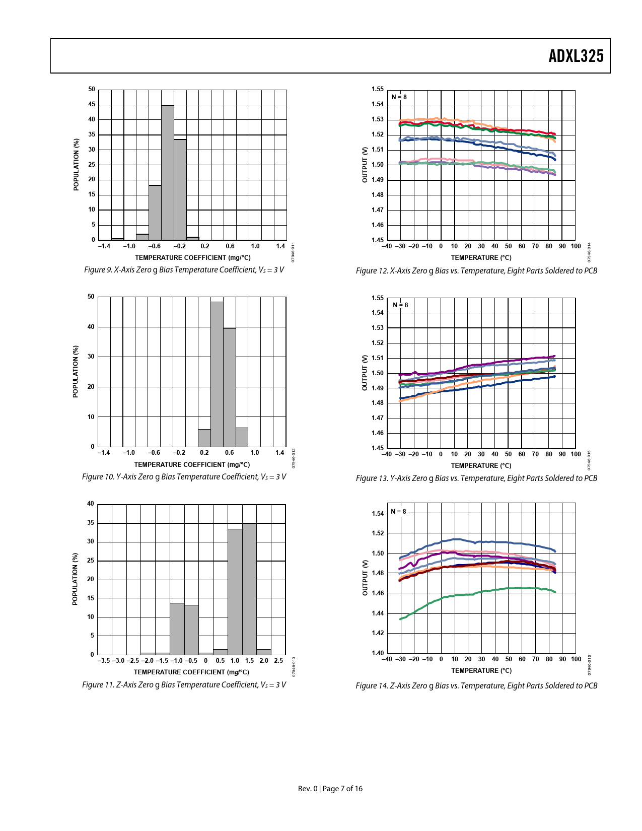 0 07 Figure 9. X-Axis Zero g Bias Temperature Coefficient, VS = 3 V Figure 12. X-Axis Zero g Bias vs. Temperature, Eight Parts Soldered to PCB