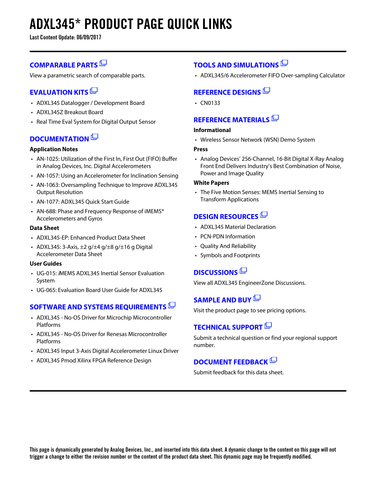 ADXL345* PRODUCT PAGE QUICK LINKS Last Content Update: 06/09/2017COMPARABLE PARTSTOOLS AND SIMULATIONS View a parametric search of comparable parts. • ADXL345/6 Accelerometer FIFO Over-sampling Calculator EVALUATION KITSREFERENCE DESIGNS • ADXL345 Datalogger / Development Board • CN0133 • ADXL345Z Breakout Board • Real Time Eval System for Digital Output Sensor REFERENCE MATERIALSInformationalDOCUMENTATION • Wireless Sensor Network (WSN) Demo System Application NotesPress • AN-1025: Utilization of the First In, First Out (FIFO) Buffer • Analog Devices’ 256-Channel, 16-Bit Digital X-Ray Analog in Analog Devices, Inc. Digital Accelerometers Front End Delivers Industry’s Best Combination of Noise, • AN-1057: Using an Accelerometer for Inclination Sensing Power and Image Quality • AN-1063: Oversampling Technique to Improve ADXL345 White Papers Output Resolution • The Five Motion Senses: MEMS Inertial Sensing to • AN-1077: ADXL345 Quick Start Guide Transform Applications • AN-688: Phase and Frequency Response of iMEMS® Accelerometers and Gyros DESIGN RESOURCESData Sheet • ADXL345 Material Declaration • ADXL345-EP: Enhanced Product Data Sheet • PCN-PDN Information • ADXL345: 3-Axis, ±2 g/±4 g/±8 g/±16 g Digital • Quality And Reliability Accelerometer Data Sheet • Symbols and Footprints User Guides • UG-015: iMEMS ADXL345 Inertial Sensor Evaluation DISCUSSIONS System View all ADXL345 EngineerZone Discussions. • UG-065: Evaluation Board User Guide for ADXL345 SAMPLE AND BUYSOFTWARE AND SYSTEMS REQUIREMENTS Visit the product page to see pricing options. • ADXL345 - No-OS Driver for Microchip Microcontroller Platforms TECHNICAL SUPPORT • ADXL345 - No-OS Driver for Renesas Microcontroller Submit a technical question or find your regional support Platforms number. • ADXL345 Input 3-Axis Digital Accelerometer Linux Driver • ADXL345 Pmod Xilinx FPGA Reference Design DOCUMENT FEEDBACK Submit feedback for this data sheet. This page is dynamically generated by Analog Devices, Inc., and inserted into this data sheet. A dynamic change to the content on this page will not trigger a change to either the revision number or the content of the product data sheet. This dynamic page may be frequently modified.