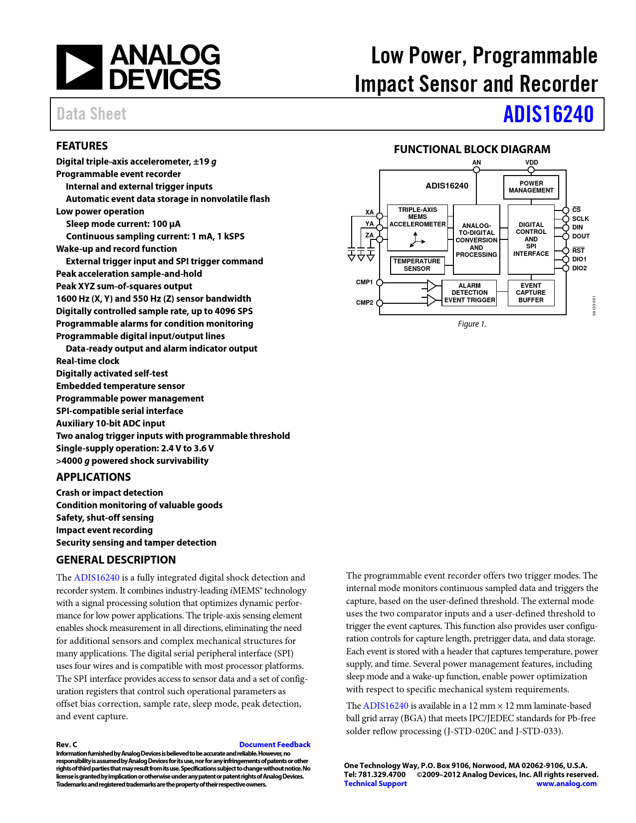 Programmable digital input/output lines Data-ready output and alarm indicator output Real-time clock Digitally activated self-test Embedded temperature sensor Programmable power management SPI-compatible serial interface Auxiliary 10-bit ADC input Two analog trigger inputs with programmable threshold Single-supply operation: 2.4 V to 3.6 V >4000 g powered shock survivability APPLICATIONS Crash or impact detection Condition monitoring of valuable goods Safety, shut-off sensing Impact event recording Security sensing and tamper detection GENERAL DESCRIPTION