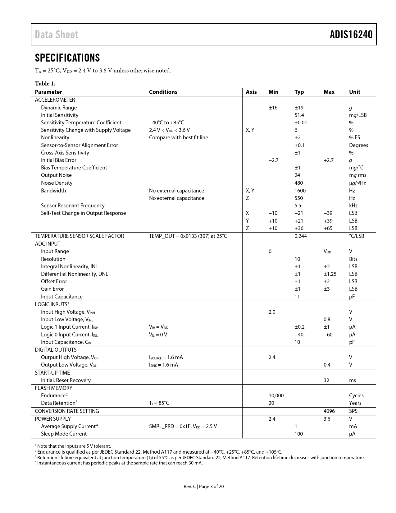 Data Sheet ADIS16240 SPECIFICATIONS Table 1 Parameter Conditions Axis Min Typ Max Unit