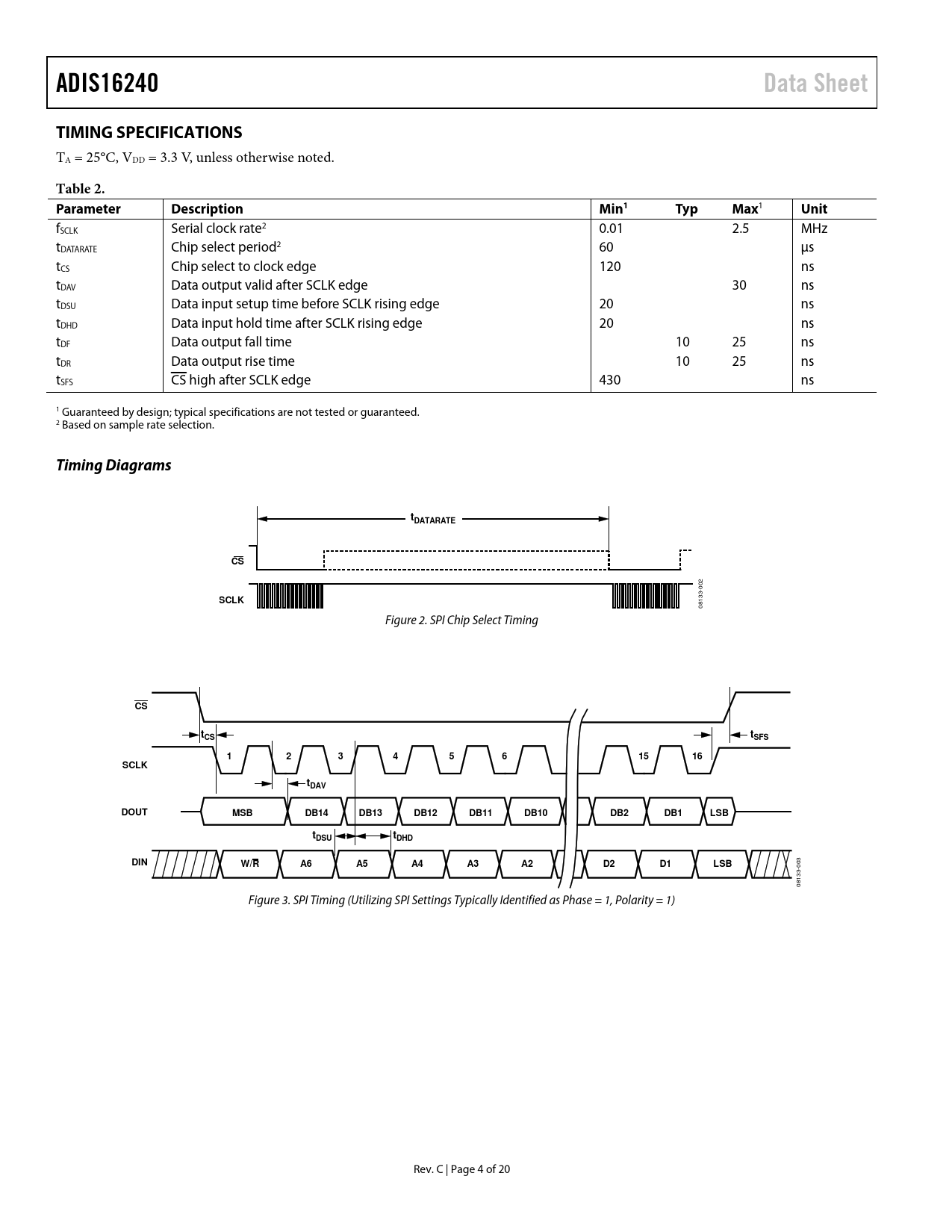 link to page 5 link to page 5 link to page 5 link to page 5 ADIS16240Data SheetTIMING SPECIFICATIONS TA = 25°C, VDD = 3.3 V, unless otherwise noted. Table 2. Parameter DescriptionMin1 TypMax 1 Unit fSCLK Serial clock rate2 0.01 2.5 MHz tDATARATE Chip select period2 60 μs tCS Chip select to clock edge 120 ns tDAV Data output valid after SCLK edge 30 ns tDSU Data input setup time before SCLK rising edge 20 ns tDHD Data input hold time after SCLK rising edge 20 ns tDF Data output fall time 10 25 ns tDR Data output rise time 10 25 ns tSFS CS high after SCLK edge 430 ns 1 Guaranteed by design; typical specifications are not tested or guaranteed. 2 Based on sample rate selection. Timing DiagramstDATARATECS 2 00 3- SCLK 13 08 Figure 2. SPI Chip Select Timing CStCStSFS1234561516SCLKtDAVDOUTMSBDB14DB13DB12DB11DB10DB2DB1LSBttDSUDHDDINW/RA6A5A4A3A2D2D1LSB 03 0 3- 13 08 Figure 3. SPI Timing (Utilizing SPI Settings Typically Identified as Phase = 1, Polarity = 1) Rev. C | Page 4 of 20 Document Outline Features Applications Functional Block Diagram General Description Revision History Specifications Timing Specifications Timing Diagrams Absolute Maximum Ratings ESD Caution Pin Configuration and Function Descriptions Typical Performance Characteristics Theory of Operation Sensing Element Data Sampling and Processing User Interface SPI Interface User Registers Capture Basic Operation SPI Write Commands Memory Map Output Data Registers Processing Sensor Data Event Recorder Internal Trigger Setup External Trigger Setup Buffer Memory Configuration Event Organization Reading Event Data Transient Behavior During Capture Operational Control Internal Sample Rate Global Commands Input/Output Lines Offset Adjustment Diagnostics Clock Checksum Flash Memory Endurance Management Applications Information Assembly Interface Printed Circuit Board (PCB) Outline Dimensions Ordering Guide
