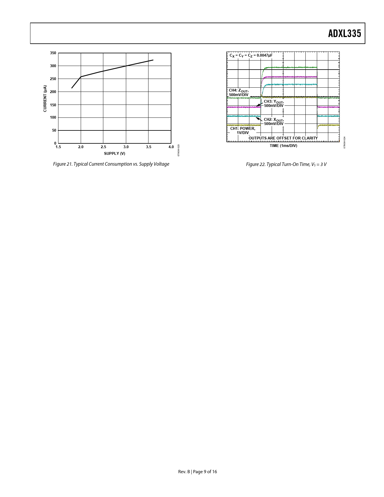 ADXL335350CX = CY = CZ = 0.0047µF300250A) µCH4: Z( 200OUT,500mV/DIVNTCH3: YOUT,150500mV/DIVCURRE100CH2: XOUT,500mV/DIV50CH1: POWER,1V/DIVOUTPUTS ARE OFFSET FOR CLARITY 24 0 0 8- 1.52.02.53.03.54.0 3 TIME (1ms/DIV) 80 -02 07 08 SUPPLY (V) 78 0 Figure 21. Typical Current Consumption vs. Supply Voltage Figure 22. Typical Turn-On Time, VS = 3 V Rev. B | Page 9 of 16 Document Outline FEATURES APPLICATIONS GENERAL DESCRIPTION FUNCTIONAL BLOCK DIAGRAM TABLE OF CONTENTS REVISION HISTORY SPECIFICATIONS ABSOLUTE MAXIMUM RATINGS ESD CAUTION PIN CONFIGURATION AND FUNCTION DESCRIPTIONS TYPICAL PERFORMANCE CHARACTERISTICS THEORY OF OPERATION MECHANICAL SENSOR PERFORMANCE APPLICATIONS INFORMATION POWER SUPPLY DECOUPLING SETTING THE BANDWIDTH USING CX, CY, AND CZ SELF-TEST DESIGN TRADE-OFFS FOR SELECTING FILTER CHARACTERISTICS: THE NOISE/BW TRADE-OFF USE WITH OPERATING VOLTAGES OTHER THAN 3 V AXES OF ACCELERATION SENSITIVITY LAYOUT AND DESIGN RECOMMENDATIONS OUTLINE DIMENSIONS ORDERING GUIDE