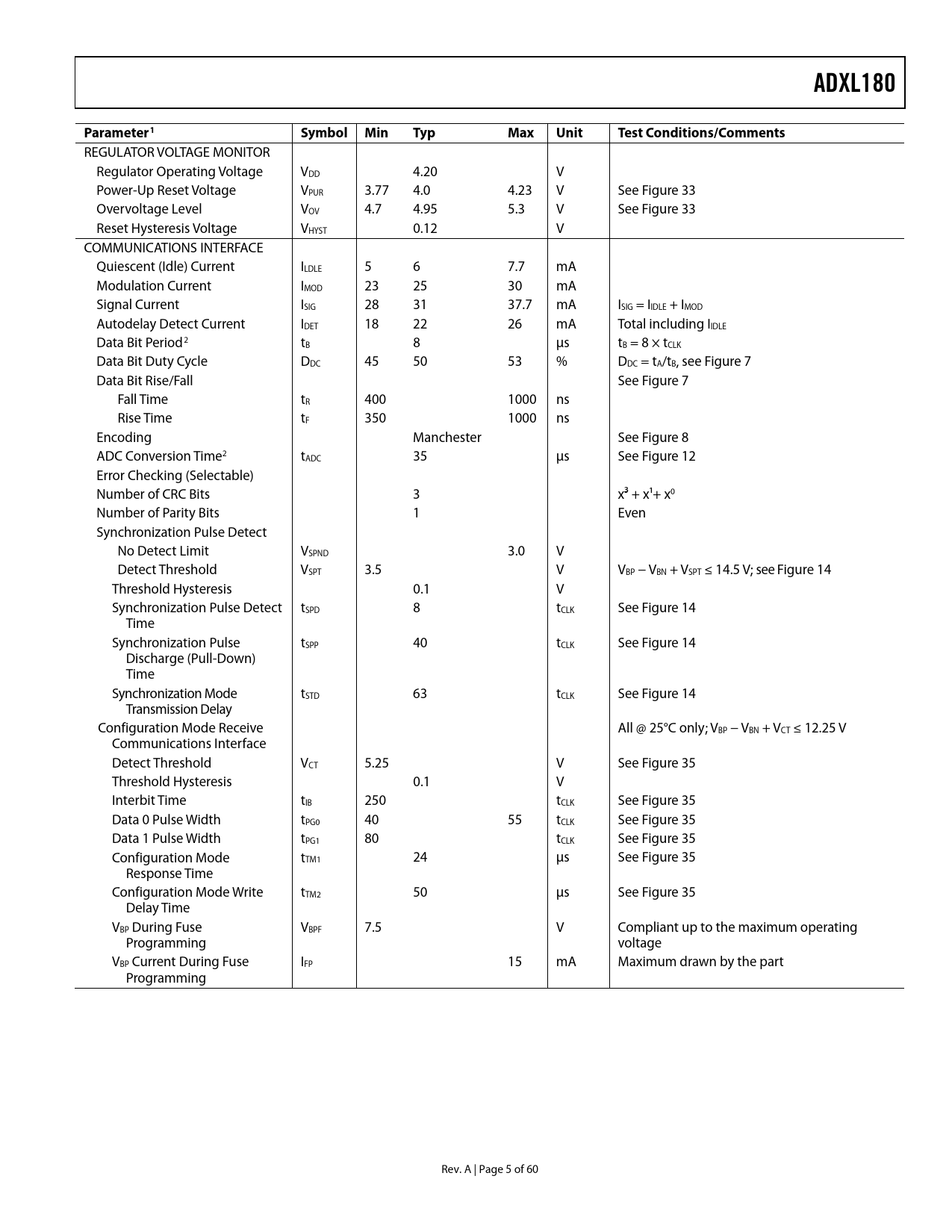 REGULATOR VOLTAGE MONITOR Regulator Operating Voltage VDD 4.20 V Power-Up Reset Voltage VPUR 3.77 4.0 4.23 V See Figure 33 Overvoltage Level VOV 4.7 4.95 5.3 V See Figure 33 Reset Hysteresis Voltage VHYST 0.12 V COMMUNICATIONS INTERFACE Quiescent (Idle) Current ILDLE 5 6 7.7 mA Modulation Current IMOD 23 25 30 mA Signal Current ISIG 28 31 37.7 mA ISIG = IIDLE + IMOD Autodelay Detect Current IDET 18 22 26 mA Total including IIDLE Data Bit Period2 tB 8 μs tB = 8 × tCLK Data Bit Duty Cycle DDC 45 50 53 % DDC = tA/tB, see Figure 7 Data Bit Rise/Fall See Figure 7 Fall Time tR 400 1000 ns Rise Time tF 350 1000 ns Encoding Manchester See Figure 8 ADC Conversion Time2 tADC 35 μs See Figure 12 Error Checking (Selectable) Number of CRC Bits 3 x³ + x¹+ x0 Number of Parity Bits 1 Even Synchronization Pulse Detect No Detect Limit VSPND 3.0 V Detect Threshold VSPT 3.5 V VBP − VBN + VSPT ≤ 14.5 V; see Figure 14 Threshold Hysteresis 0.1 V Synchronization Pulse Detect tSPD 8 tCLK See Figure 14 Time Synchronization Pulse tSPP 40 tCLK See Figure 14 Discharge (Pull-Down) Time Synchronization Mode tSTD 63 tCLK See Figure 14 Transmission Delay Configuration Mode Receive All @ 25°C only; VBP − VBN + VCT ≤ 12.25 V Communications Interface Detect Threshold VCT 5.25 V See Figure 35 Threshold Hysteresis 0.1 V Interbit Time tIB 250 tCLK See Figure 35 Data 0 Pulse Width tPG0 40 55 tCLK See Figure 35 Data 1 Pulse Width tPG1 80 tCLK See Figure 35 Configuration Mode tTM1 24 μs See Figure 35 Response Time Configuration Mode Write tTM2 50 μs See Figure 35 Delay Time VBP During Fuse VBPF 7.5 V Compliant up to the maximum operating Programming voltage VBP Current During Fuse IFP 15 mA Maximum drawn by the part Programming Rev. A | Page 5 of 60 Document Outline FEATURES APPLICATIONS GENERAL DESCRIPTION FUNCTIONAL BLOCK DIAGRAM TABLE OF CONTENTS REVISION HISTORY SPECIFICATIONS ABSOLUTE MAXIMUM RATINGS ESD CAUTION PIN CONFIGURATION AND FUNCTION DESCRIPTIONS TERMINOLOGY THEORY OF OPERATION OVERVIEW ACCELERATION SENSOR SIGNAL PROCESSING DIGITAL COMMUNICATIONS STATE MACHINE 2-WIRE CURRENT MODULATED INTERFACE SYNCHRONOUS OPERATION AND DUAL DEVICE BUS PROGRAMMED MEMORY AND CONFIGURABILITY Factory-Programmed Serial Number and Manufacturer Information User-Programmable Data Register User-Programmed Configuration Physical Layer (ISO Layer 1) Data Link Layer (ISO Layer 2) Application Layer (ISO Layer 7) PHYSICAL INTERFACE APPLICATION CIRCUIT CURRENT MODULATION MANCHESTER DATA ENCODING OPERATION AT LOW VBP OR LOW VDD OPERATION AT HIGH VDD COMMUNICATIONS TIMING AND BUS TOPOLOGIES DATA TRANSMISSION ASYNCHRONOUS COMMUNICATION Asynchronous Single Device Point-to-Point Topology SYNCHRONOUS COMMUNICATION Configuring the ADXL180 for Synchronous Operation Synchronization Pulse Detection Bus Discharge Enable Synchronous Single Device Point-to-Point Topology SYNCHRONOUS COMMUNICATION MODE—DUAL DEVICE Configuring Synchronous Operation Delay Selection Fixed Delay Mode Autodelay Mode Dual Device Synchronous Parallel Topology Dual Device Synchronous Series Topology DATA FRAME DEFINITION DATA FRAME TRANSMISSION FORMAT DATA FRAME CONFIGURATION OPTIONS ACCELERATION DATA CODING STATE VECTOR CODING STATE VECTOR DESCRIPTIONS TRANSMISSION ERROR DETECTION OPTIONS CRC Encoding Parity Encoding APPLICATION LAYER: COMMUNICATION PROTOCOL STATE MACHINE ADXL180 STATE MACHINE PHASE 1: POWER-ON-RESET INITIALIZATION PHASE 2: DEVICE DATA TRANSMISSION Overview Influence of MD on Data Range Device Data Mapping in Phase 2 PHASE 2: MODE DESCRIPTION Mode 0 Asynchronous Mode Synchronous Mode Mode 1 Mode 2 Device Data User Bits and User Register (UREG) 10-Bit Data and Mode 2 Mode 3 Device Data User Register (UREG) Use with State Vector Enabled Illegal Configuration: Mode 3 and 8-Bit Data PHASE 3: SELF-TEST DIAGNOSTIC Concept of Self-Test Internal and External Self-Test Option External Self-Test Internal Self-Test Influence of MD Selections On Transmitted Self-Test Data PHASE 4: AUTO-ZERO INITIALIZATION Fast Auto-Zero Mode Error Reporting PHASE 5: NORMAL OPERATION Slow Auto-Zero Error Reporting SIGNAL RANGE AND FILTERING TRANSFER FUNCTION OVERVIEW RANGE THREE-POLE BESSEL FILTER AUTO-ZERO OPERATION Offset Drift Monitoring ERROR DETECTION OVERVIEW PARITY ERROR DUE TO COMMUNICATIONS PROTOCOL CONFIGURATION BIT ERROR SELF-TEST ERROR OFFSET ERROR/OFFSET DRIFT MONITORING VOLTAGE REGULATOR MONITOR RESET OPERATION TEST AND DIAGNOSTIC TOOLS VSCI SIGNAL CHAIN INPUT TEST PIN VSCO ANALOG SIGNAL CHAIN OUTPUT TEST PIN CONFIGURATION SPECIFICATION OVERVIEW CONFIGURATION MODE TRANSMIT COMMUNICATIONS PROTOCOL CONFIGURATION MODE COMMAND (RECEIVE) COMMUNICATIONS PROTOCOL CONFIGURATION MODE COMMUNICATIONS HANDSHAKING CONFIGURATION AND USER DATA REGISTERS CONFIGURATION MODE EXIT SERIAL NUMBER AND MANUFACTURER IDENTIFICATION DATA REGISTERS PROGRAMMING THE CONFIGURATION AND USER DATA REGISTERS OTP PROGRAMMING CONDITIONS AND CONSIDERATIONS CONFIGURATION/USER REGISTER OTP PARITY CONFIGURATION MODE ERROR REPORTING CONFIGURATION REGISTER REFERENCE UD[7:0] USER DATA BITS UD8 CONFIGURATION BIT BDE SCOE FDLY ADME STI FC[1:0] RG[2:0] MD[1:0] SYEN AZE ERC DAT SVD CUPAR AND CUPRG AXIS OF SENSITIVITY BRANDING OUTLINE DIMENSIONS ORDERING GUIDE