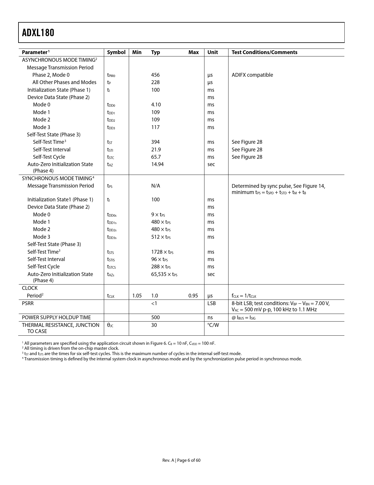 ASYNCHRONOUS MODE TIMING2 Message Transmission Period Phase 2, Mode 0 tPM0 456 μs ADIFX compatible All Other Phases and Modes tP 228 μs Initialization State (Phase 1) tI 100 ms Device Data State (Phase 2) ms Mode 0 tDD0 4.10 ms Mode 1 tDD1 109 ms Mode 2 tDD2 109 ms Mode 3 tDD3 117 ms Self-Test State (Phase 3) Self-Test Time3 tST 394 ms See Figure 28 Self-Test Interval tSTI 21.9 ms See Figure 28 Self-Test Cycle tSTC 65.7 ms See Figure 28 Auto-Zero Initialization State tAZ 14.94 sec (Phase 4) SYNCHRONOUS MODE TIMING4 Message Transmission Period tPS N/A Determined by sync pulse, See Figure 14, minimum tPS = tSPD + tSTD + tM + tB Initialization State1 (Phase 1) tI 100 ms Device Data State (Phase 2) ms Mode 0 tDD0s 9 × tPS ms Mode 1 tDD1s 480 × tPS ms Mode 2 tDD2s 480 × tPS ms Mode 3 tDD3s 512 × tPS ms Self-Test State (Phase 3) Self-Test Time3 tSTS 1728 × tPS ms Self-Test Interval tSTIS 96 × tPS ms Self-Test Cycle tSTCS 288 × tPS ms Auto-Zero Initialization State tAZs 65,535 × tPS sec (Phase 4) CLOCK Period2 tCLK 1.05 1.0 0.95 μs fCLK = 1/tCLK PSRR <1 LSB 8-bit LSB; test conditions: VBP − VBN = 7.00 V, VAC = 500 mV p-p, 100 kHz to 1.1 MHz POWER SUPPLY HOLDUP TIME 500 ns @ IBUS = ISIG THERMAL RESISTANCE, JUNCTION θJC 30 °C/W TO CASE 1 All parameters are specified using the application circuit shown in Figure 6. CB = 10 nF, CVDD = 100 nF. 2 All timing is driven from the on-chip master clock. 3 tST and tSTS are the times for six self-test cycles. This is the maximum number of cycles in the internal self-test mode. 4 Transmission timing is defined by the internal system clock in asynchronous mode and by the synchronization pulse period in synchronous mode. Rev. A | Page 6 of 60 Document Outline FEATURES APPLICATIONS GENERAL DESCRIPTION FUNCTIONAL BLOCK DIAGRAM TABLE OF CONTENTS REVISION HISTORY SPECIFICATIONS ABSOLUTE MAXIMUM RATINGS ESD CAUTION PIN CONFIGURATION AND FUNCTION DESCRIPTIONS TERMINOLOGY THEORY OF OPERATION OVERVIEW ACCELERATION SENSOR SIGNAL PROCESSING DIGITAL COMMUNICATIONS STATE MACHINE 2-WIRE CURRENT MODULATED INTERFACE SYNCHRONOUS OPERATION AND DUAL DEVICE BUS PROGRAMMED MEMORY AND CONFIGURABILITY Factory-Programmed Serial Number and Manufacturer Information User-Programmable Data Register User-Programmed Configuration Physical Layer (ISO Layer 1) Data Link Layer (ISO Layer 2) Application Layer (ISO Layer 7) PHYSICAL INTERFACE APPLICATION CIRCUIT CURRENT MODULATION MANCHESTER DATA ENCODING OPERATION AT LOW VBP OR LOW VDD OPERATION AT HIGH VDD COMMUNICATIONS TIMING AND BUS TOPOLOGIES DATA TRANSMISSION ASYNCHRONOUS COMMUNICATION Asynchronous Single Device Point-to-Point Topology SYNCHRONOUS COMMUNICATION Configuring the ADXL180 for Synchronous Operation Synchronization Pulse Detection Bus Discharge Enable Synchronous Single Device Point-to-Point Topology SYNCHRONOUS COMMUNICATION MODE—DUAL DEVICE Configuring Synchronous Operation Delay Selection Fixed Delay Mode Autodelay Mode Dual Device Synchronous Parallel Topology Dual Device Synchronous Series Topology DATA FRAME DEFINITION DATA FRAME TRANSMISSION FORMAT DATA FRAME CONFIGURATION OPTIONS ACCELERATION DATA CODING STATE VECTOR CODING STATE VECTOR DESCRIPTIONS TRANSMISSION ERROR DETECTION OPTIONS CRC Encoding Parity Encoding APPLICATION LAYER: COMMUNICATION PROTOCOL STATE MACHINE ADXL180 STATE MACHINE PHASE 1: POWER-ON-RESET INITIALIZATION PHASE 2: DEVICE DATA TRANSMISSION Overview Influence of MD on Data Range Device Data Mapping in Phase 2 PHASE 2: MODE DESCRIPTION Mode 0 Asynchronous Mode Synchronous Mode Mode 1 Mode 2 Device Data User Bits and User Register (UREG) 10-Bit Data and Mode 2 Mode 3 Device Data User Register (UREG) Use with State Vector Enabled Illegal Configuration: Mode 3 and 8-Bit Data PHASE 3: SELF-TEST DIAGNOSTIC Concept of Self-Test Internal and External Self-Test Option External Self-Test Internal Self-Test Influence of MD Selections On Transmitted Self-Test Data PHASE 4: AUTO-ZERO INITIALIZATION Fast Auto-Zero Mode Error Reporting PHASE 5: NORMAL OPERATION Slow Auto-Zero Error Reporting SIGNAL RANGE AND FILTERING TRANSFER FUNCTION OVERVIEW RANGE THREE-POLE BESSEL FILTER AUTO-ZERO OPERATION Offset Drift Monitoring ERROR DETECTION OVERVIEW PARITY ERROR DUE TO COMMUNICATIONS PROTOCOL CONFIGURATION BIT ERROR SELF-TEST ERROR OFFSET ERROR/OFFSET DRIFT MONITORING VOLTAGE REGULATOR MONITOR RESET OPERATION TEST AND DIAGNOSTIC TOOLS VSCI SIGNAL CHAIN INPUT TEST PIN VSCO ANALOG SIGNAL CHAIN OUTPUT TEST PIN CONFIGURATION SPECIFICATION OVERVIEW CONFIGURATION MODE TRANSMIT COMMUNICATIONS PROTOCOL CONFIGURATION MODE COMMAND (RECEIVE) COMMUNICATIONS PROTOCOL CONFIGURATION MODE COMMUNICATIONS HANDSHAKING CONFIGURATION AND USER DATA REGISTERS CONFIGURATION MODE EXIT SERIAL NUMBER AND MANUFACTURER IDENTIFICATION DATA REGISTERS PROGRAMMING THE CONFIGURATION AND USER DATA REGISTERS OTP PROGRAMMING CONDITIONS AND CONSIDERATIONS CONFIGURATION/USER REGISTER OTP PARITY CONFIGURATION MODE ERROR REPORTING CONFIGURATION REGISTER REFERENCE UD[7:0] USER DATA BITS UD8 CONFIGURATION BIT BDE SCOE FDLY ADME STI FC[1:0] RG[2:0] MD[1:0] SYEN AZE ERC DAT SVD CUPAR AND CUPRG AXIS OF SENSITIVITY BRANDING OUTLINE DIMENSIONS ORDERING GUIDE
