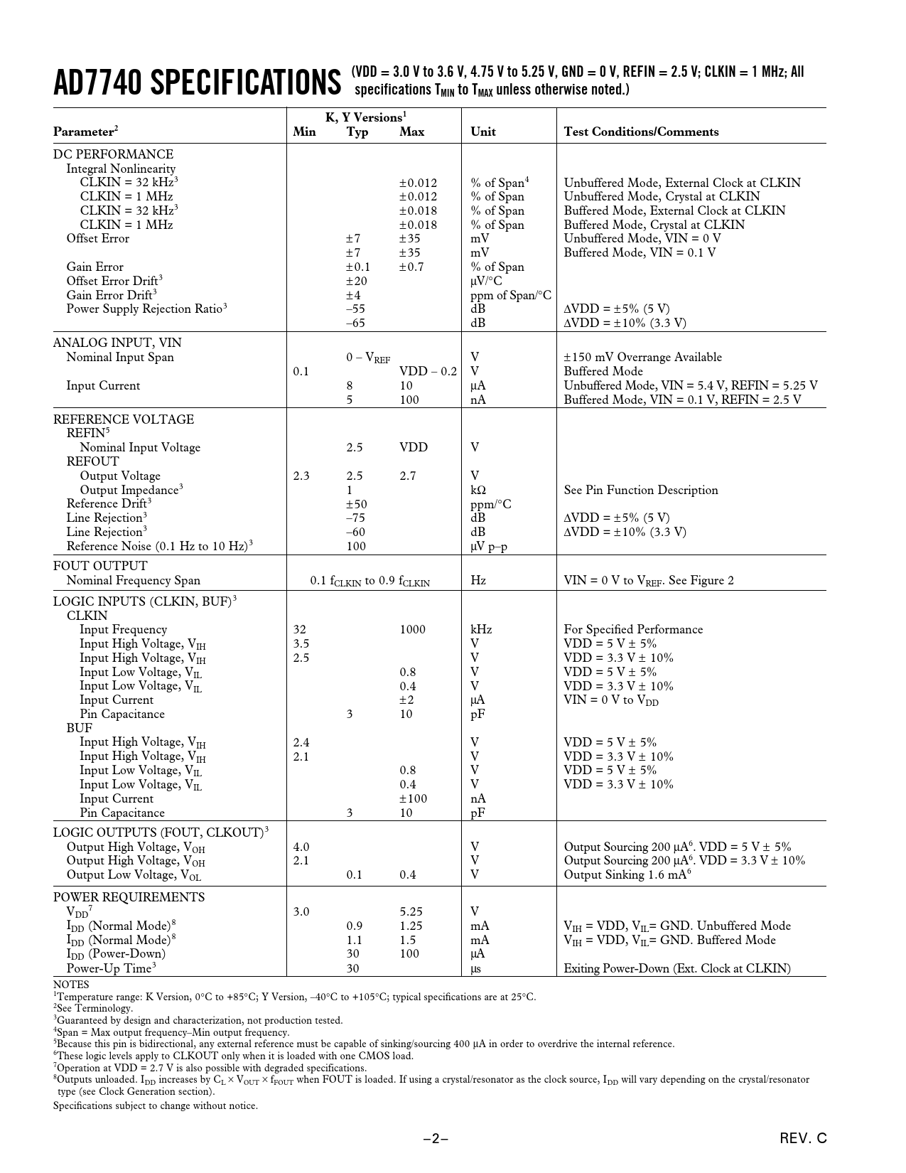 AD7740 SPECIFICATIONS (VDD = 3.0 V to 3.6 V, 4.75 V to 5.25 V, GND = 0 V, REFIN = 2.5 V; CLKIN = 1 MHz; All specifications TMIN to TMAX unless otherwise noted.) K, Y Versions1 Parameter2 Min Typ Max Unit Test Conditions/Comments
