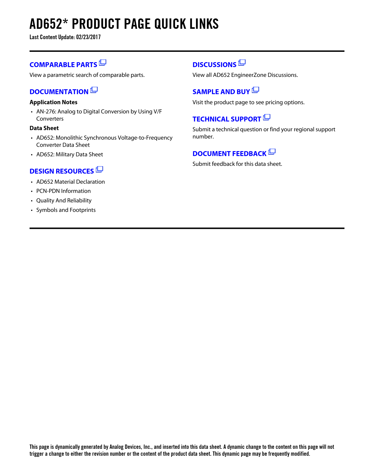 Submit a technical question or find your regional support • AD652: Monolithic Synchronous Voltage-to-Frequency number. Converter Data Sheet • AD652: Military Data Sheet
