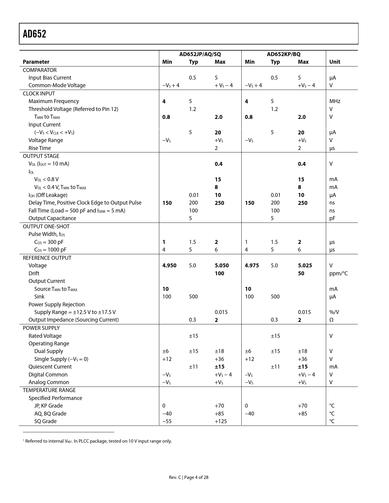 AD652AD652JP/AQ/SQAD652KP/BQParameter MinTypMaxMinTypMaxUnit COMPARATOR Input Bias Current 0.5 5 0.5 5 µA Common-Mode Voltage −VS + 4 + VS − 4 −VS + 4 +VS − 4 V CLOCK INPUT Maximum Frequency 4 5 4 5 MHz Threshold Voltage (Referred to Pin 12) 1.2 1.2 V TMIN to TMAX 0.82.0 0.82.0 V Input Current (−VS < VCLK < +VS) 5 20 5 20 µA Voltage Range −VS +VS −VS +VS V Rise Time 2 2 µs OUTPUT STAGE VOL (IOUT = 10 mA) 0.40.4 V IOL VOL < 0.8 V 1515 mA VOL < 0.4 V, TMIN to TMAX 88 mA IOH (Off Leakage) 0.01 10 0.01 10 µA Delay Time, Positive Clock Edge to Output Pulse 150 200 250 150 200 250 ns Fall Time (Load = 500 pF and ISINK = 5 mA) 100 100 ns Output Capacitance 5 5 pF OUTPUT ONE-SHOT Pulse Width, tOS COS = 300 pF 1 1.5 2 1 1.5 2 µs COS = 1000 pF 4 5 6 4 5 6 µs REFERENCE OUTPUT Voltage 4.950 5.0 5.050 4.975 5.0 5.025 V Drift 10050 ppm/°C Output Current Source TMIN to TMAX 1010 mA Sink 100 500 100 500 µA Power Supply Rejection Supply Range = ±12.5 V to ±17.5 V 0.015 0.015 %/V Output Impedance (Sourcing Current) 0.3 2 0.3 2 Ω POWER SUPPLY Rated Voltage ±15 ±15 V Operating Range Dual Supply ±6 ±15 ±18 ±6 ±15 ±18 V Single Supply (−VS = 0) +12 +36 +12 +36 V Quiescent Current ±11 ±15 ±11 ±15 mA Digital Common −VS +VS − 4 –VS +VS − 4 V Analog Common −VS +VS −VS +VS V TEMPERATURE RANGE Specified Performance JP, KP Grade 0 +70 0 +70 °C AQ, BQ Grade −40 +85 −40 +85 °C SQ Grade −55 +125 °C 1 Referred to internal VREF. In PLCC package, tested on 10 V input range only. Rev. C | Page 4 of 28 Document Outline FEATURES PRODUCT DESCRIPTION PRODUCT HIGHLIGHTS FUNCTIONAL BLOCK DIAGRAM SPECIFICATIONS ABSOLUTE MAXIMUM RATINGS ESD CAUTION DEFINITIONS OF SPECIFICATIONS THEORY OF OPERATION OVERRANGE SVFC CONNECTION FOR DUAL SUPPLY, POSITIVE INPUT VOLTAGES SVFC CONNECTIONS FOR NEGATIVE INPUT VOLTAGES SVFC CONNECTION FOR BIPOLAR INPUT VOLTAGES PLCC CONNECTIONS GAIN AND OFFSET CALIBRATION GAIN PERFORMANCE REFERENCE NOISE DIGITAL INTERFACING CONSIDERATIONS COMPONENT SELECTION DIGITAL GROUND SINGLE-SUPPLY OPERATION FREQUENCY-TO-VOLTAGE CONVERTER DECOUPLING AND GROUNDING FREQUENCY OUTPUT MULTIPLIER SINGLE-LINE MULTIPLEXED DATA TRANSMISSION Multiplexer Transmitter SVFC Demultiplexer Analog Signal Reconstruction ISOLATED FRONT END A-TO-D CONVERSION DELTA MODULATOR BRIDGE TRANSDUCER INTERFACE OUTLINE DIMENSIONS ORDERING GUIDE