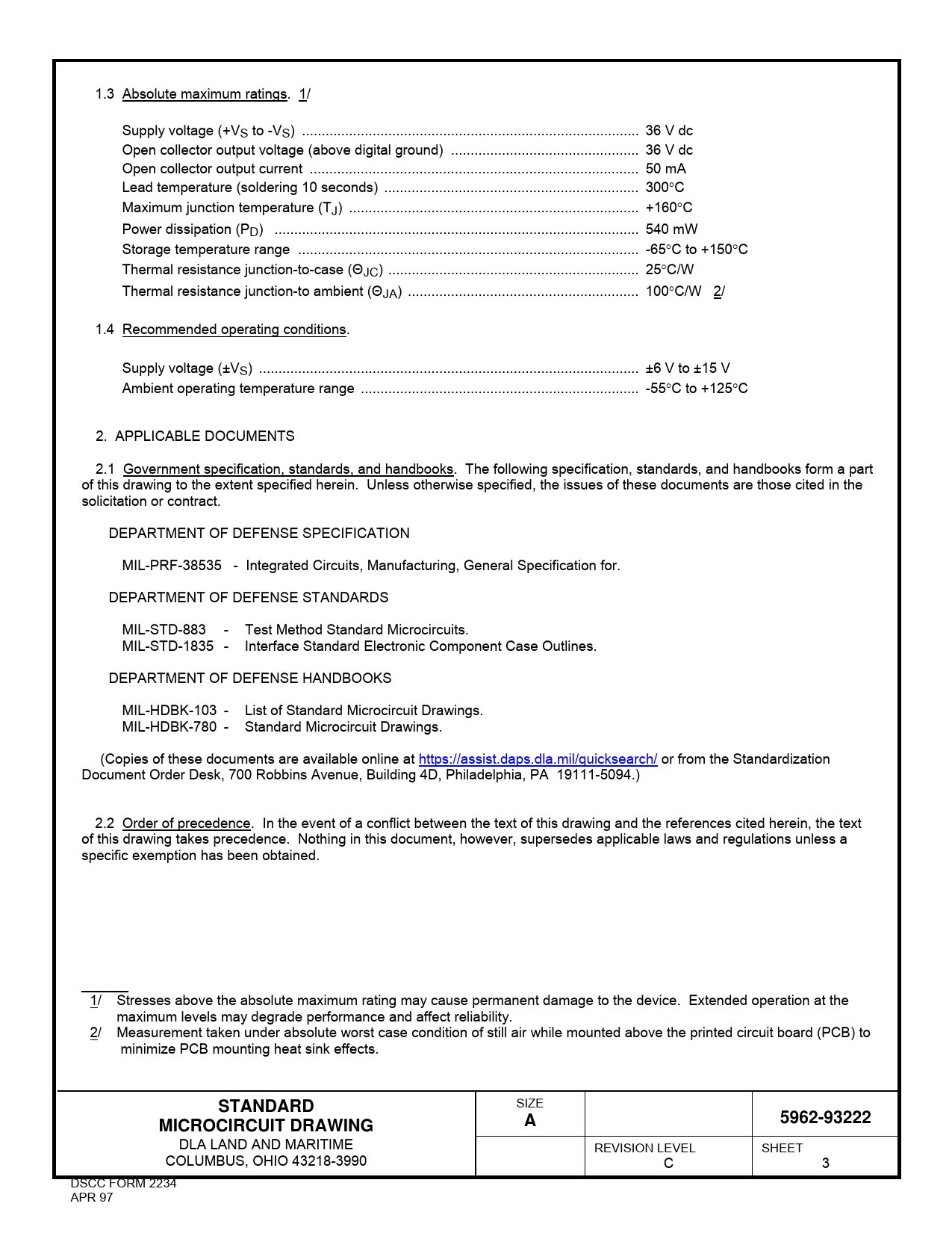 1.3 Absolute maximum ratings. 1/ Supply voltage (+VS to -VS) .. 36 V dc Open collector output voltage (above digital ground) .. 36 V dc Open collector output current .. 50 mA Lead temperature (soldering 10 seconds) ... 300C Maximum junction temperature (TJ) .. +160C Power dissipation (PD) ... 540 mW Storage temperature range ... -65C to +150C Thermal resistance junction-to-case (ΘJC) .. 25C/W Thermal resistance junction-to ambient (ΘJA) ... 100C/W 2/ 1.4 Recommended operating conditions. Supply voltage (±VS) ... ±6 V to ±15 V Ambient operating temperature range ... -55C to +125C 2. APPLICABLE DOCUMENTS 2.1 Government specification, standards, and handbooks. The following specification, standards, and handbooks form a part of this drawing to the extent specified herein. Unless otherwise specified, the issues of these documents are those cited in the solicitation or contract. DEPARTMENT OF DEFENSE SPECIFICATION MIL-PRF-38535 - Integrated Circuits, Manufacturing, General Specification for. DEPARTMENT OF DEFENSE STANDARDS MIL-STD-883 - Test Method Standard Microcircuits. MIL-STD-1835 - Interface Standard Electronic Component Case Outlines. DEPARTMENT OF DEFENSE HANDBOOKS MIL-HDBK-103 - List of Standard Microcircuit Drawings. MIL-HDBK-780 - Standard Microcircuit Drawings. (Copies of these documents are available online at https://assist.daps.dla.mil/quicksearch/ or from the Standardization Document Order Desk, 700 Robbins Avenue, Building 4D, Philadelphia, PA 19111-5094.) 2.2 Order of precedence. In the event of a conflict between the text of this drawing and the references cited herein, the text of this drawing takes precedence. Nothing in this document, however, supersedes applicable laws and regulations unless a specific exemption has been obtained. ______ 1/ Stresses above the absolute maximum rating may cause permanent damage to the device. Extended operation at the maximum levels may degrade performance and affect reliability. 2/ Measurement taken under absolute worst case condition of still air while mounted above the printed circuit board (PCB) to minimize PCB mounting heat sink effects. STANDARD SIZE 5962-93222MICROCIRCUIT DRAWINGA DLA LAND AND MARITIME REVISION LEVEL SHEET COLUMBUS, OHIO 43218-3990 C 3 DSCC FORM 2234 APR 97