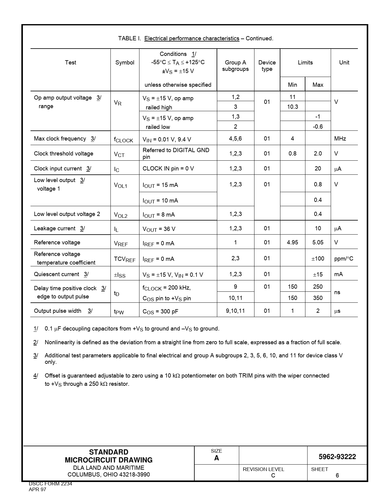 TABLE I. Electrical performance characteristics – Continued. Conditions 1/ Test Symbol -55C  TA +125C Group A Device Limits Unit ±V subgroups type S = 15 V unless otherwise specified Min Max Op amp output voltage 3/ V 1,2 11 V S = 15 V, op amp 01 V range R railed high 3 10.3 V 1,3 -1 S = 15 V, op amp railed low 2 -0.6 Max clock frequency 3/ fCLOCK VIN = 0.01 V, 9.4 V 4,5,6 01 4 MHz Referred to DIGITAL GND Clock threshold voltage VCT 1,2,3 01 0.8 2.0 V pin Clock input current 3/ IC CLOCK IN pin = 0 V 1,2,3 01 20 A Low level output 3/ V voltage 1 OL1 IOUT = 15 mA 1,2,3 01 0.8 V IOUT = 10 mA 0.4 Low level output voltage 2 VOL2 IOUT = 8 mA 1,2,3 0.4 Leakage current 3/ IL VOUT = 36 V 1,2,3 01 10 A Reference voltage VREF IREF = 0 mA 1 01 4.95 5.05 V Reference voltage TCV temperature coefficient REF IREF = 0 mA 2,3 01 100 ppm/C Quiescent current 3/ ISS VS = 15 V, VIN = 0.1 V 1,2,3 01 15 mA Delay time positive clock 3/ fCLOCK = 200 kHz, 9 01 150 250 t ns edge to output pulse D COS pin to +VS pin 10,11 150 350 Output pulse width 3/ tPW COS = 300 pF 9,10,11 01 1 2 s 1/ 0.1 F decoupling capacitors from +VS to ground and –VS to ground. 2/ Nonlinearity is defined as the deviation from a straight line from zero to full scale, expressed as a fraction of full scale. 3/ Additional test parameters applicable to final electrical and group A subgroups 2, 3, 5, 6, 10, and 11 for device class V only. 4/ Offset is guaranteed adjustable to zero using a 10 k potentiometer on both TRIM pins with the wiper connected to +VS through a 250 k resistor.