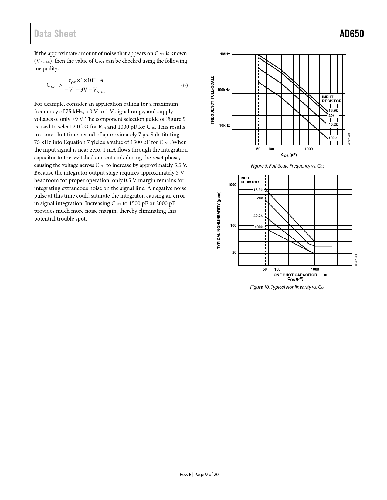 link to page 10 Data SheetAD650 If the approximate amount of noise that appears on CINT is known 1MHz (VNOISE), then the value of CINT can be checked using the following inequality: t 1 10 3 A LE OS A C (8) C INT V V 3 V S 100kHz S NOISE L- LINPUTFURESISTOR For example, consider an application calling for a maximum Y C N frequency of 75 kHz, a 0 V to 1 V signal range, and supply E U16.9kQ20k voltages of only ±9 V. The component selection guide of Figure 9 E FR is used to select 2.0 kΩ for R 10kHz40.2k IN and 1000 pF for COS. This results in a one-shot time period of approximately 7 μs. Substituting 08 0 100k 7- 75 kHz into Equation 7 yields a value of 1300 pF for C 79 INT. When 00 the input signal is near zero, 1 mA flows through the integration 501001000 capacitor to the switched current sink during the reset phase, COS (pF) causing the voltage across CINT to increase by approximately 5.5 V. Figure 9. Full-Scale Frequency vs. COS Because the integrator output stage requires approximately 3 V headroom for proper operation, only 0.5 V margin remains for INPUT RESISTOR1000 integrating extraneous noise on the signal line. A negative noise )16.9k pulse at this time could saturate the integrator, causing an error pm p20k in signal integration. Increasing C ( INT to 1500 pF or 2000 pF ITY provides much more noise margin, thereby eliminating this R A E40.2k potential trouble spot. IN L N100O100kN L A IC P TY20 9 00 7- 79 00 501001000ONE SHOT CAPACITORCOS (pF) Figure 10. Typical Nonlinearity vs. COS Rev. E | Page 9 of 20 Document Outline Features Functional Block Diagram Product Description Product Highlights Revision History Specifications Absolute Maximum Ratings ESD Caution Pin Configurations and Function Descriptions Circuit Operation Unipolar Configuration One-Shot Timing Component Selection Bipolar V/F Unipolar V/F, Negative Input Voltage F/V Conversion High Frequency Operation Decoupling and Grounding Temperature Coefficients Nonlinearity Specification PSRR Other Circuit Considerations Applications Differential Voltage-to-Frequency Conversion Autozero Circuit Phase-Locked Loop F/V Conversion Outline Dimensions Ordering Guide
