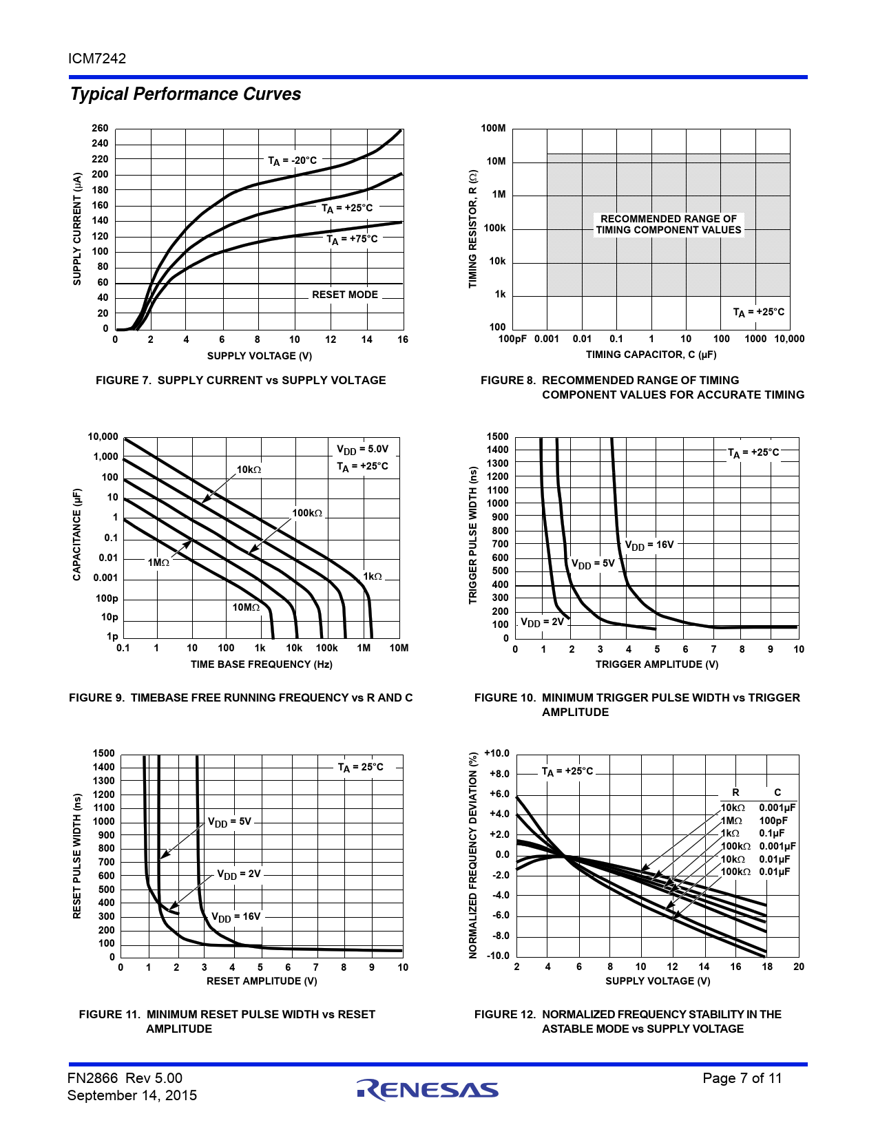 180 T , R 1M N 160 T R A = +25°C O 140 T RECOMMENDED RANGE OF RRE IS 100k TIMING COMPONENT VALUES 120 S CU TA = +75°C Y 100 RE 10k PPL 80 ING U M S 60 TI 40 RESET MODE 1k 20 TA = +25°C 0 100 0 2 4 6 8 10 12 14 16 100pF 0.001 0.01 0.1 1 10 100 1000 10,000 SUPPLY VOLTAGE (V) TIMING CAPACITOR, C (µF) FIGURE 7. SUPPLY CURRENT vs SUPPLY VOLTAGE FIGURE 8. RECOMMENDED RANGE OF TIMING COMPONENT VALUES FOR ACCURATE TIMING 10,000 1500 VDD = 5.0V 1400 1,000 TA = +25°C T 1300 10k A = +25°C 100 s) n 1200 1100 10 (µF) 1000 IDTH ( E 100k C 1 900 N E W A 800 0.1 700 VDD = 16V ACIT 0.01 1M 600 R PULS V 500 DD = 5V CAP 0.001 1k 400 100p 300 TRIGGE 10M 200 10p 100 VDD = 2V 1p 0 0.1 1 10 100 1k 10k 100k 1M 10M 0 1 2 3 4 5 6 7 8 9 10 TIME BASE FREQUENCY (Hz) TRIGGER AMPLITUDE (V) FIGURE 9. TIMEBASE FREE RUNNING FREQUENCY vs R AND C FIGURE 10. MINIMUM TRIGGER PULSE WIDTH vs TRIGGER AMPLITUDE 1500 ) +10.0 1400 TA = 25°C +8.0 TA = +25°C 1300 ION (% 1200 T +6.0 R C 1100 10k 0.001µF +4.0 1000 VDD = 5V 1M 100pF 900 +2.0 1k 0.1µF 800 100k 0.001µF 0.0 700 10k 0.01µF 600 VDD = 2V -2.0 100k 0.01µF T PULSE WIDTH (ns) 500 E -4.0 400 RES 300 VDD = 16V -6.0 200 -8.0 100 0 NORMALIZED FREQUENCY DEVIA -10.0 0 1 2 3 4 5 6 7 8 9 10 2 4 6 8 10 12 14 16 18 20 RESET AMPLITUDE (V) SUPPLY VOLTAGE (V) FIGURE 11. MINIMUM RESET PULSE WIDTH vs RESET FIGURE 12. NORMALIZED FREQUENCY STABILITY IN THE AMPLITUDE ASTABLE MODE vs SUPPLY VOLTAGE