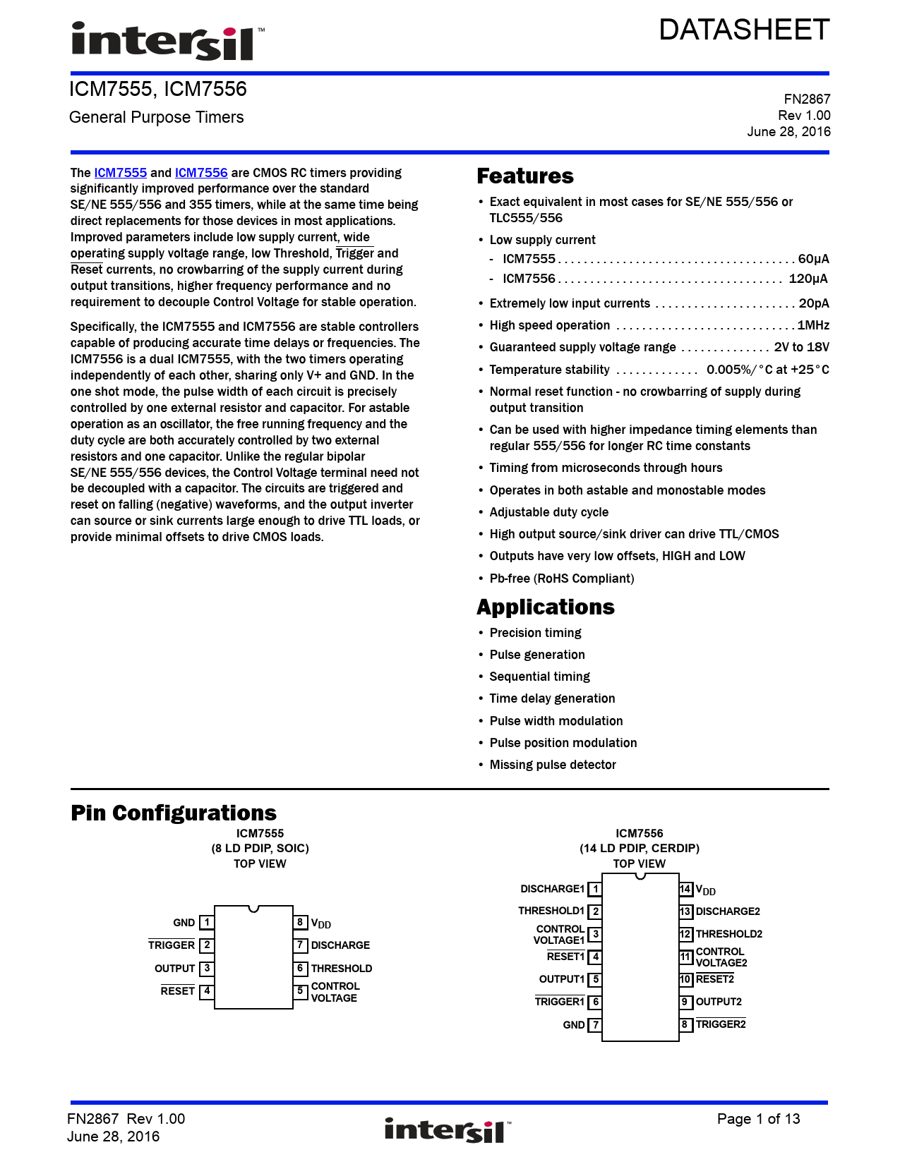 DATASHEET ICM7555, ICM7556 FN2867 General Purpose Timers Rev 1.00 June 28, 2016 The ICM7555 and ICM7556 are CMOS RC timers providing Features significantly improved performance over the standard SE/NE 555/556 and 355 timers, while at the same time being • Exact equivalent in most cases for SE/NE 555/556 or direct replacements for those devices in most applications. TLC555/556 Improved parameters include low supply current, wide • Low supply current operating supply voltage range, low Threshold, Trigger and - ICM7555 . 60µA Reset currents, no crowbarring of the supply current during output transitions, higher frequency performance and no - ICM7556 . 120µA requirement to decouple Control Voltage for stable operation. • Extremely low input currents . 20pA Specifically, the ICM7555 and ICM7556 are stable controllers • High speed operation . 1MHz capable of producing accurate time delays or frequencies. The • Guaranteed supply voltage range . 2V to 18V ICM7556 is a dual ICM7555, with the two timers operating independently of each other, sharing only V+ and GND. In the • Temperature stability . 0.005%/°C at +25°C one shot mode, the pulse width of each circuit is precisely • Normal reset function - no crowbarring of supply during controlled by one external resistor and capacitor. For astable output transition operation as an oscillator, the free running frequency and the • Can be used with higher impedance timing elements than duty cycle are both accurately controlled by two external regular 555/556 for longer RC time constants resistors and one capacitor. Unlike the regular bipolar SE/NE 555/556 devices, the Control Voltage terminal need not • Timing from microseconds through hours be decoupled with a capacitor. The circuits are triggered and • Operates in both astable and monostable modes reset on falling (negative) waveforms, and the output inverter • Adjustable duty cycle can source or sink currents large enough to drive TTL loads, or provide minimal offsets to drive CMOS loads. • High output source/sink driver can drive TTL/CMOS • Outputs have very low offsets, HIGH and LOW • Pb-free (RoHS Compliant) Applications • Precision timing • Pulse generation • Sequential timing • Time delay generation • Pulse width modulation • Pulse position modulation • Missing pulse detector Pin Configurations ICM7555ICM7556(8 LD PDIP, SOIC)(14 LD PDIP, CERDIP) TOP VIEW TOP VIEW DISCHARGE1 114 VDDTHRESHOLD1 213 DISCHARGE2GND 18 VDDCONTROL 312 THRESHOLD2TRIGGER 27 DISCHARGEVOLTAGE1RESET1CONTROL411OUTPUT 36 THRESHOLDVOLTAGE2OUTPUT1 510 RESET2RESET 45 CONTROLVOLTAGETRIGGER1 69 OUTPUT2GND 78 TRIGGER2 FN2867 Rev 1.00 Page 1 of 13 June 28, 2016