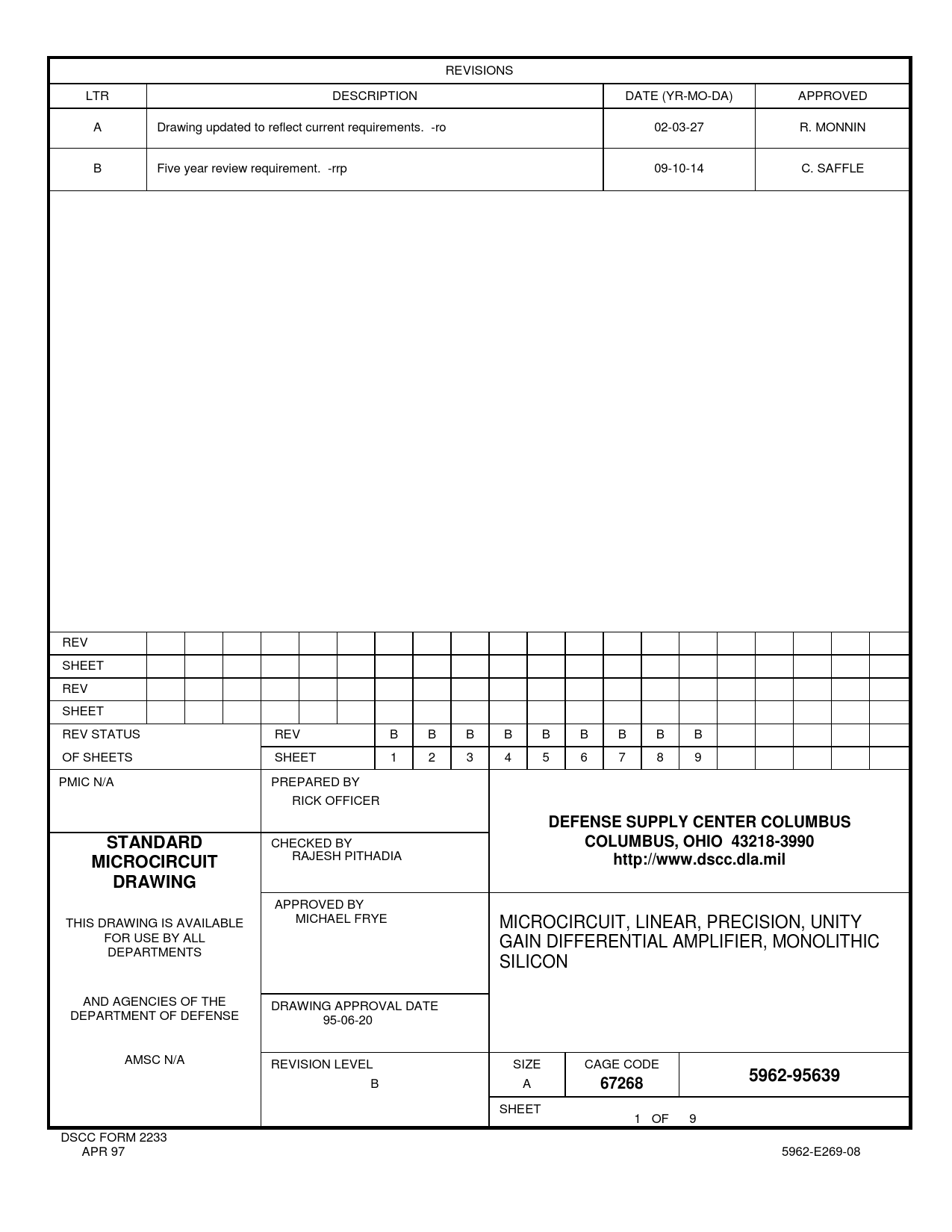 APPROVED BY THIS DRAWING IS AVAILABLE MICHAEL FRYE MICROCIRCUIT, LINEAR, PRECISION, UNITY FOR USE BY ALL GAIN DIFFERENTIAL AMPLIFIER, MONOLITHIC DEPARTMENTS SILICON AND AGENCIES OF THE DRAWING APPROVAL DATE DEPARTMENT OF DEFENSE 95-06-20 AMSC N/A REVISION LEVEL SIZE CAGE CODE