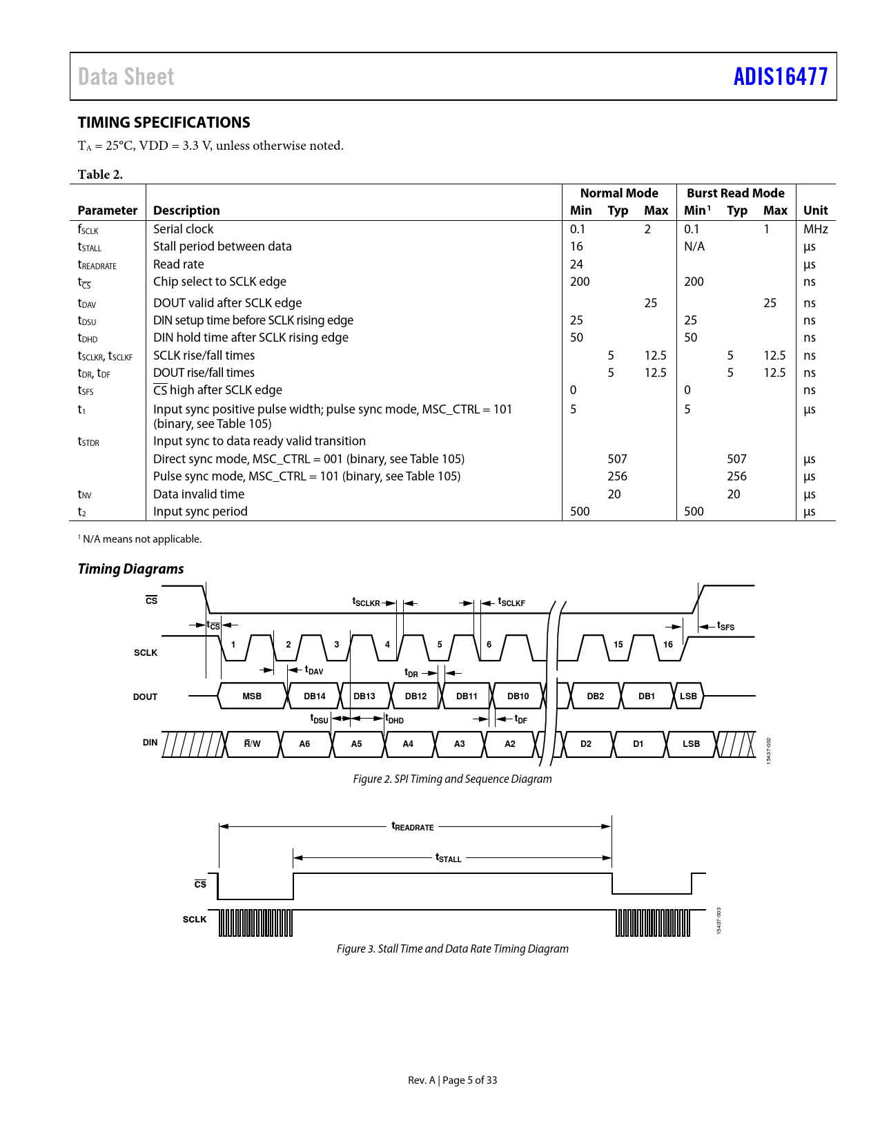 Data Sheet. ADIS16477. TIMING SPECIFICATIONS. Table 2. Normal Mode. Burst Read Mode. Parameter Description