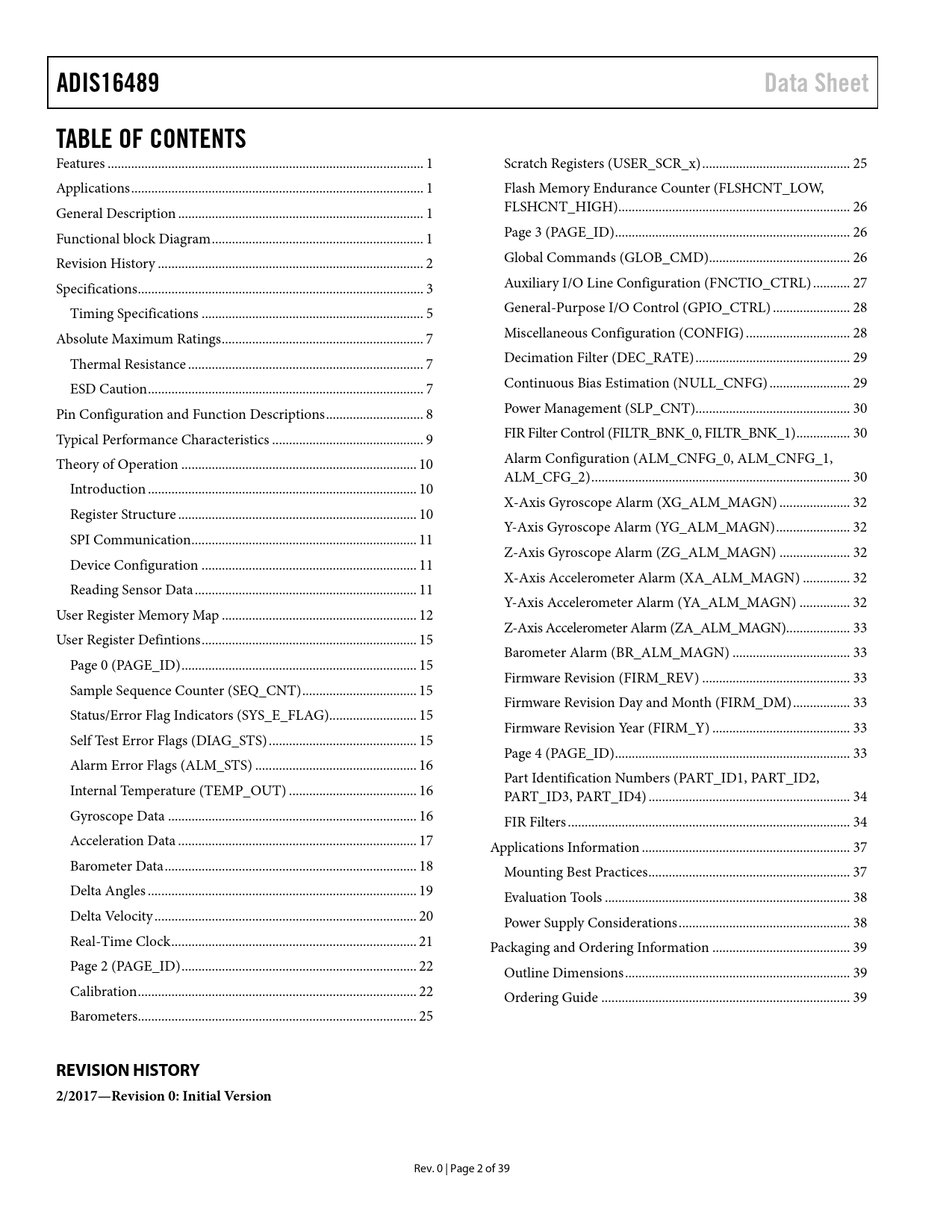 link to page 1 link to page 1 link to page 1 link to page 1 link to page 3 link to page 4 link to page 6 link to page 8 link to page 8 link to page 8 link to page 9 link to page 10 link to page 11 link to page 11 link to page 11 link to page 12 link to page 12 link to page 12 link to page 13 link to page 16 link to page 16 link to page 16 link to page 16 link to page 16 link to page 17 link to page 17 link to page 17 link to page 18 link to page 19 link to page 20 link to page 21 link to page 22 link to page 23 link to page 23 link to page 26 link to page 26 link to page 27 link to page 27 link to page 27 link to page 27 link to page 28 link to page 29 link to page 29 link to page 30 link to page 30 link to page 31 link to page 31 link to page 31 link to page 31 link to page 33 link to page 33 link to page 33 link to page 33 link to page 33 link to page 34 link to page 34 link to page 34 link to page 34 link to page 34 link to page 34 link to page 35 link to page 35 link to page 35 link to page 38 link to page 38 link to page 39 link to page 39 link to page 40 link to page 40 link to page 40 ADIS16489Data SheetTABLE OF CONTENTS Features .. 1 Scratch Registers (USER_SCR_x) .. 25 Applications ... 1 Flash Memory Endurance Counter (FLSHCNT_LOW, General Description ... 1 FLSHCNT_HIGH)... 26 Functional block Diagram ... 1 Page 3 (PAGE_ID) .. 26 Revision History ... 2 Global Commands (GLOB_CMD).. 26 Specifications ... 3 Auxiliary I/O Line Configuration (FNCTIO_CTRL) ... 27 Timing Specifications .. 5 General-Purpose I/O Control (GPIO_CTRL) ... 28 Absolute Maximum Ratings .. 7 Miscellaneous Configuration (CONFIG) ... 28 Thermal Resistance .. 7 Decimation Filter (DEC_RATE) .. 29 ESD Caution .. 7 Continuous Bias Estimation (NULL_CNFG) .. 29 Pin Configuration and Function Descriptions ... 8 Power Management (SLP_CNT).. 30 Typical Performance Characteristics ... 9 FIR Filter Control (FILTR_BNK_0, FILTR_BNK_1) .. 30 Theory of Operation .. 10 Alarm Configuration (ALM_CNFG_0, ALM_CNFG_1, ALM_CFG_2) ... 30 Introduction .. 10 X-Axis Gyroscope Alarm (XG_ALM_MAGN) ... 32 Register Structure ... 10 Y-Axis Gyroscope Alarm (YG_ALM_MAGN) .. 32 SPI Communication ... 11 Z-Axis Gyroscope Alarm (ZG_ALM_MAGN) ... 32 Device Configuration .. 11 X-Axis Accelerometer Alarm (XA_ALM_MAGN) .. 32 Reading Sensor Data .. 11 Y-Axis Accelerometer Alarm (YA_ALM_MAGN) ... 32 User Register Memory Map .. 12 Z-Axis Accelerometer Alarm (ZA_ALM_MAGN)... 33 User Register Defintions .. 15 Barometer Alarm (BR_ALM_MAGN) ... 33 Page 0 (PAGE_ID) .. 15 Firmware Revision (FIRM_REV) .. 33 Sample Sequence Counter (SEQ_CNT) .. 15 Firmware Revision Day and Month (FIRM_DM) ... 33 Status/Error Flag Indicators (SYS_E_FLAG) .. 15 Firmware Revision Year (FIRM_Y) ... 33 Self Test Error Flags (DIAG_STS) .. 15 Page 4 (PAGE_ID) .. 33 Alarm Error Flags (ALM_STS) .. 16 Part Identification Numbers (PART_ID1, PART_ID2, Internal Temperature (TEMP_OUT) .. 16 PART_ID3, PART_ID4) .. 34 Gyroscope Data .. 16 FIR Filters .. 34 Acceleration Data ... 17 Applications Information .. 37 Barometer Data ... 18 Mounting Best Practices .. 37 Delta Angles .. 19 Evaluation Tools ... 38 Delta Velocity .. 20 Power Supply Considerations ... 38 Real-Time Clock ... 21 Packaging and Ordering Information ... 39 Page 2 (PAGE_ID) .. 22 Outline Dimensions ... 39 Calibration ... 22 Ordering Guide .. 39 Barometers ... 25 REVISION HISTORY 2/2017—Revision 0: Initial Version Rev. 0 | Page 2 of 39 Document Outline Features Applications General Description Functional block Diagram Revision History Specifications Timing Specifications Register Specific Stall Times Timing Diagrams Absolute Maximum Ratings Thermal Resistance ESD Caution Pin Configuration and Function Descriptions Typical Performance Characteristics Theory of Operation Introduction Register Structure SPI Communication Device Configuration Dual Memory Structure Reading Sensor Data User Register Memory Map User Register Defintions Page 0 (PAGE_ID) Sample Sequence Counter (SEQ_CNT) Status/Error Flag Indicators (SYS_E_FLAG) Self Test Error Flags (DIAG_STS) Alarm Error Flags (ALM_STS) Internal Temperature (TEMP_OUT) Gyroscope Data X-Axis Gyroscope (X_GYRO_LOW, X_GYRO_OUT) Y-Axis Gyroscope (Y_GYRO_LOW, Y_GYRO_OUT) Z-Axis Gyroscope (Z_GYRO_LOW, Z_GYRO_OUT) Gyroscope Resolution Acceleration Data X-Axis Accelerometer (X_ACCL_LOW, X_ACCL_OUT) Y-Axis Accelerometer (Y_ACCL_LOW, Y_ACCL_OUT) Z-Axis Accelerometer (Z_ACCL_LOW, Z_ACCL_OUT) Accelerometer Resolution Barometer Data Barometer (BAROM_LOW, BAROM_OUT) Barometer Resolution Delta Angles X-Axis Delta Angle (X_DELTANG_LOW, X_DELTANG_OUT) Y-Axis Delta Angle (Y_DELTANG_LOW, Y_DELTANG_OUT) Z-Axis Delta Angle (Z_DELTANG_LOW, Z_DELTANG_OUT) Delta Angle Resolution Delta Velocity X-Axis Delta Velocity (X_DELTVEL_LOW, X_DELTVEL_OUT) Y-Axis Delta Velocity (Y_DELTVEL_LOW, Y_DELTVEL_OUT) Z-Axis Delta Velocity (Z_DELTVEL_LOW, Z_DELTVEL_OUT) Delta Velocity Resolution Real-Time Clock Real-Time Clock: Minutes/Seconds (TIME_MS_OUT) Real-Time Clock: Days/Hours (TIME_DH_OUT) Real-Time Clock: Years/Months (TIME_YM_OUT) Product Identification ( PROD_ID) Page 2 (PAGE_ID) Calibration Calibration, Gyroscope Scale (X_GYRO_SCALE) Calibration, Gyroscope Scale (Y_GYRO_SCALE) Calibration, Gyroscope Scale (Z_GYRO_SCALE) Calibration, Accelerometer Scale (X_ACCL_SCALE) Calibration, Accelerometer Scale (Y_ACCL_SCALE) Calibration, Accelerometer Scale (Z_ACCL_SCALE) Calibration, Gyroscope Bias (XG_BIAS_LOW, XG_BIAS_HIGH) Calibration, Gyroscope Bias (YG_BIAS_LOW, YG_BIAS_HIGH) Calibration, Gyroscope Bias (ZG_BIAS_LOW, ZG_BIAS_HIGH) Calibration, Accelerometer Bias (XA_BIAS_LOW, XA_BIAS_HIGH) Calibration, Accelerometer Bias (YA_BIAS_LOW, YA_BIAS_HIGH) Calibration, Accelerometer Bias (ZA_BIAS_LOW, ZA_BIAS_HIGH) Barometers Calibration, Barometer Bias (BR_BIAS_LOW, BR_BIAS_HIGH) Scratch Registers (USER_SCR_x) Flash Memory Endurance Counter (FLSHCNT_LOW, FLSHCNT_HIGH) Page 3 (PAGE_ID) Global Commands (GLOB_CMD) Software Reset Fact