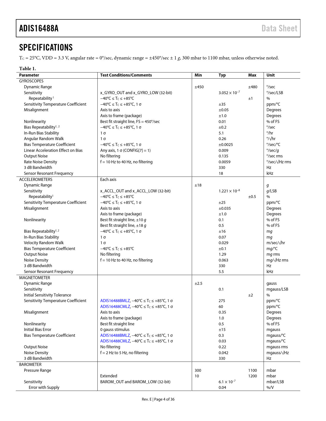 | Seiten / Seite | 36 / 4 — ADIS16488A. Data Sheet. SPECIFICATIONS. Table 1. Parameter. Test … |
