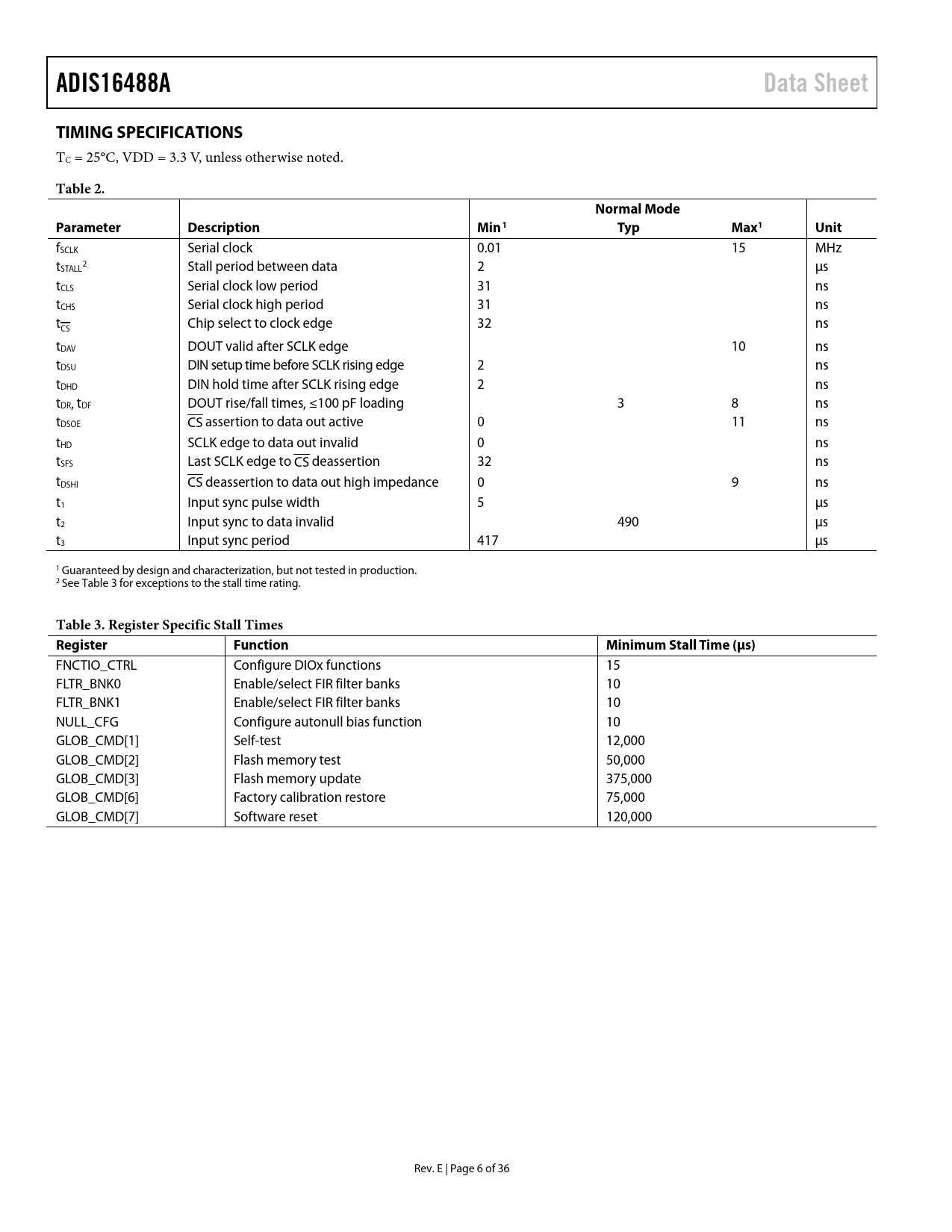 ADIS16488A. Data Sheet. TIMING SPECIFICATIONS. Table 2. Normal Mode. Parameter. Description. Min1. Typ. Max1. Unit