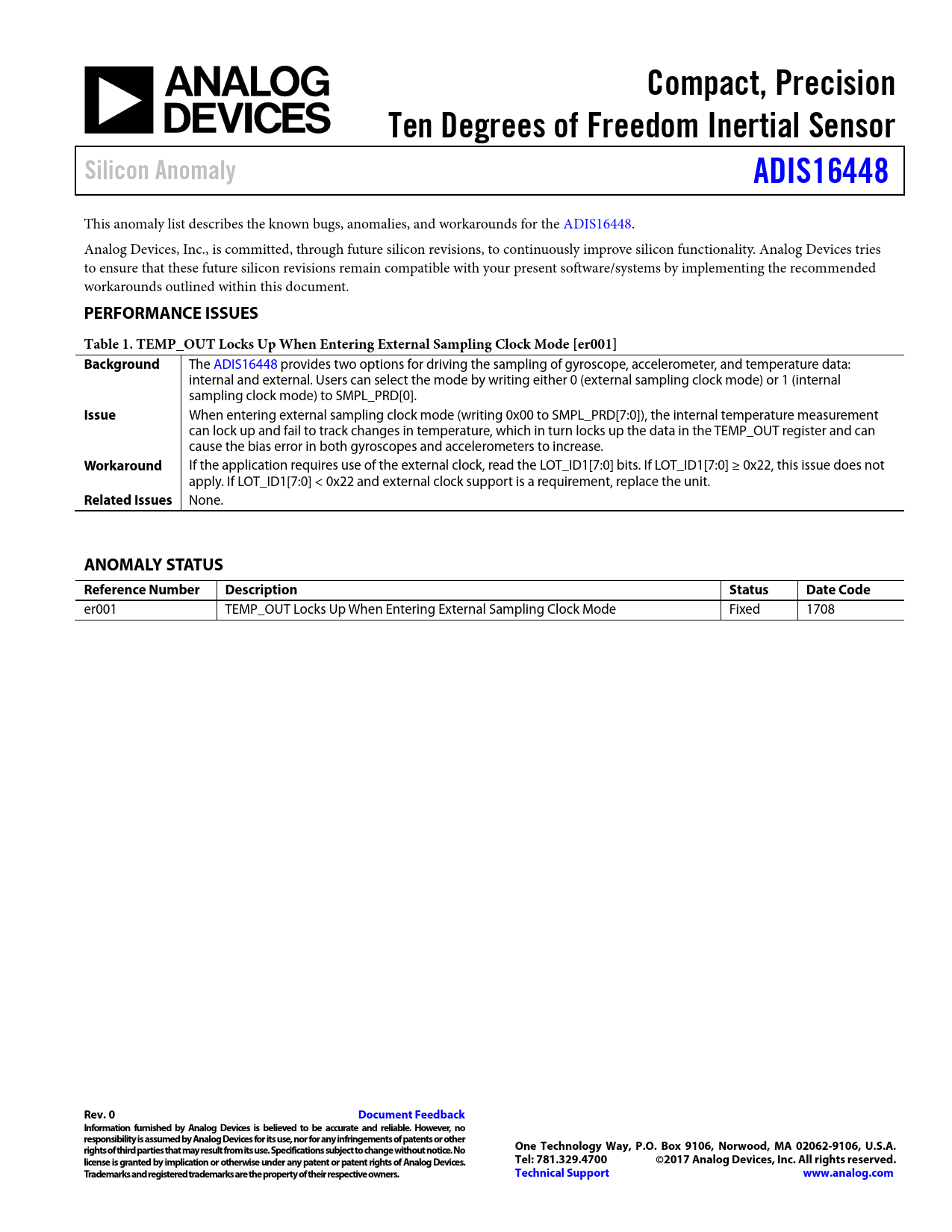 This anomaly list describes the known bugs, anomalies, and workarounds for the ADIS16448. Analog Devices, Inc., is committed, through future silicon revisions, to continuously improve silicon functionality. Analog Devices tries to ensure that these future silicon revisions remain compatible with your present software/systems by implementing the recommended workarounds outlined within this document.