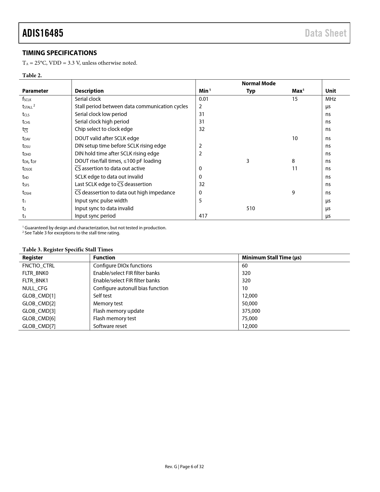 10F10F fSCLK Serial clock 0.01 15 MHz t 2 STALL Stall period between data communication cycles 2 µs 11F11F tCLS Serial clock low period 31 ns tCHS Serial clock high period 31 ns t Chip select to clock edge 32 ns A CSE tDAV DOUT valid after SCLK edge 10 ns tDSU DIN setup time before SCLK rising edge 2 ns tDHD DIN hold time after SCLK rising edge 2 ns tDR, tDF DOUT rise/fall times, ≤100 pF loading 3 8 ns tDSOE CSE assertion to data out active 0 11 ns A A tHD SCLK edge to data out invalid 0 ns tSFS Last SCLK edge to CSE deassertion 32 ns A A tDSHI CSE deassertion to data out high impedance 0 9 ns A A t1 Input sync pulse width 5 µs t2 Input sync to data invalid 510 µs t3 Input sync period 417 µs 1 Guaranteed by design and characterization, but not tested in production. 2 See Table 3 for exceptions to the stal time rating.