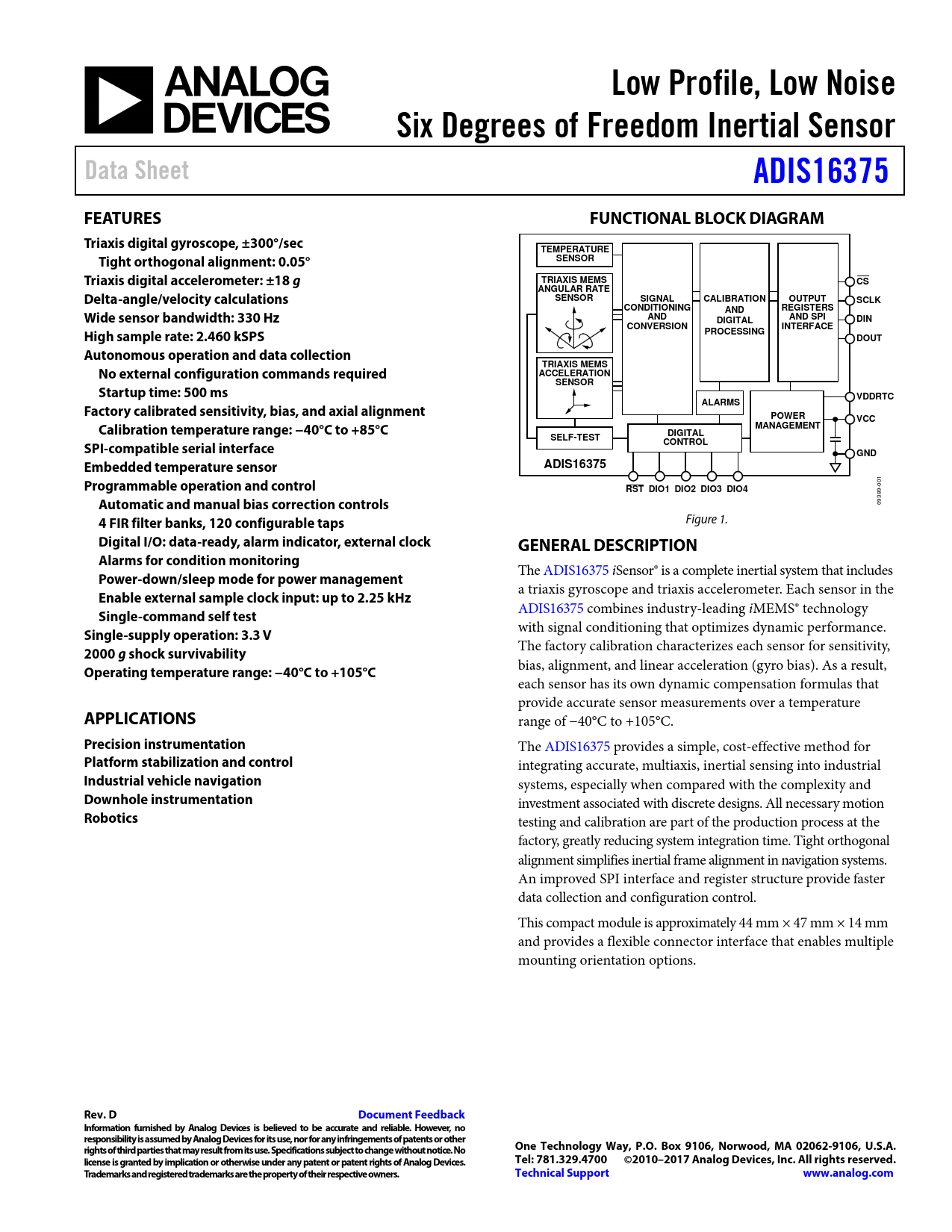 Low Profile, Low Noise. Six Degrees of Freedom Inertial Sensor. Data Sheet. ADIS16375. FEATURES. FUNCTIONAL BLOCK DIAGRAM