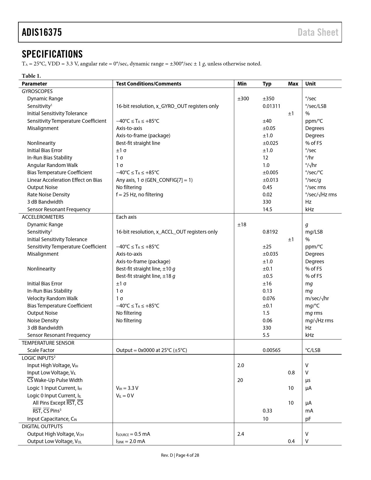 ADIS16375. Data Sheet. SPECIFICATIONS. Table 1. Parameter. Test Conditions/Comments. Min. Typ. Max Unit