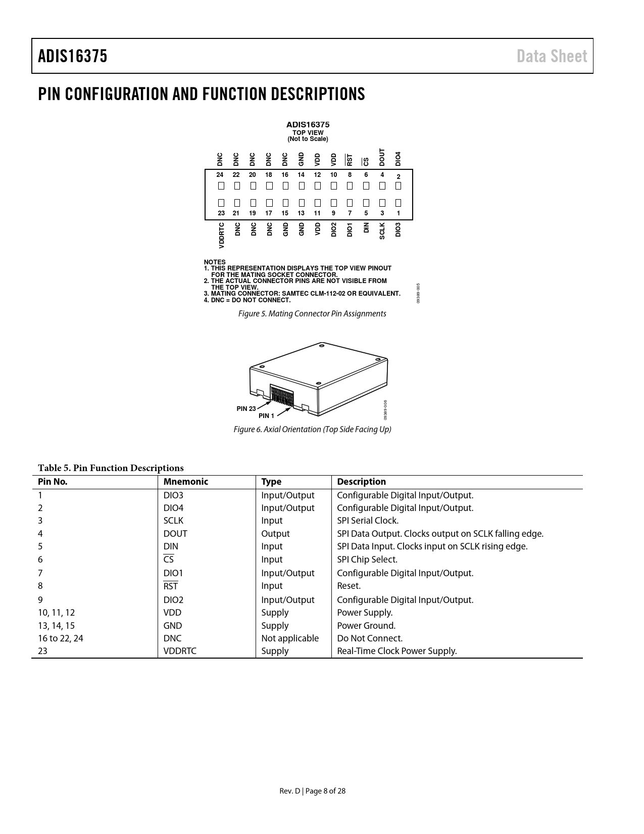 ADIS16375Data SheetPIN CONFIGURATION AND FUNCTION DESCRIPTIONSADIS16375TOP VIEW(Not to Scale)TUTNDDDDDIO4DNCDNCDNCDNCDNCGVVRSCSDOD242220181614121086422321191715131197531CNKNDNDDDIO2IO1DIIO3DNCDNCDNCGGVCLDDDSDDRT VNOTES 1. THIS REPRESENTATION DISPLAYS THE TOP VIEW PINOUT FOR THE MATING SOCKET CONNECTOR. 2. THE ACTUAL CONNECTOR PINS ARE NOT VISIBLE FROM THE TOP VIEW. 005 3. MATING CONNECTOR: SAMTEC CLM-112-02 OR EQUIVALENT. 4. DNC = DO NOT CONNECT. 09389- Figure 5. Mating Connector Pin Assignments 006 PIN 23PIN 1 09389- Figure 6. Axial Orientation (Top Side Facing Up) Table 5. Pin Function Descriptions Pin No.MnemonicTypeDescription 1 DIO3 Input/Output Configurable Digital Input/Output. 2 DIO4 Input/Output Configurable Digital Input/Output. 3 SCLK Input SPI Serial Clock. 4 DOUT Output SPI Data Output. Clocks output on SCLK falling edge. 5 DIN Input SPI Data Input. Clocks input on SCLK rising edge. 6 CS Input SPI Chip Select. 7 DIO1 Input/Output Configurable Digital Input/Output. 8 RST Input Reset. 9 DIO2 Input/Output Configurable Digital Input/Output. 10, 11, 12 VDD Supply Power Supply. 13, 14, 15 GND Supply Power Ground. 16 to 22, 24 DNC Not applicable Do Not Connect. 23 VDDRTC Supply Real-Time Clock Power Supply. Rev. D | Page 8 of 28 Document Outline Features Applications Functional Block Diagram General Description Revision History Specifications Timing Specifications Timing Diagrams Absolute Maximum Ratings ESD Caution Pin Configuration and Function Descriptions Typical Performance Characteristics Basic Operation Register Structure SPI Communication Device Configuration Dual Memory Structure Reading Sensor Data User Registers Output Data Registers Inertial Sensor Data Format Rotation Rate (Gyroscope) Acceleration Delta Angles Velocity Changes Internal Temperature Status/Alarm Indicators Product Identification Digital Signal Processing Sampling Plan Averaging/Decimation Filter FIR Filter Banks Filter Memory Organization Default Filter Performance Calibration Manual Bias Correction Manual Sensitivity Correction Bias Null Command Restoring Factory Calibration Linear Acceleration on Effect on Gyroscope Bias Point of Percussion Alignment Alarms Static Alarm Use Dynamic Alarm Use Alarm Reporting Alarm Example System Controls Global Commands Software Reset Automatic Self Test Memory Management Flash Memory Test General-Purpose I/O Data-Ready Indicator Input Sync/Clock Control General-Purpose I/O Control Power Management Real-Time Clock Configuration/Data Applications Information Mounting Tips Evaluation Tools Breakout Board, ADIS16IMU/PCBZ PC-Based Evaluation, EVAL-ADIS2 Power Supply Considerations Outline Dimensions Ordering Guide