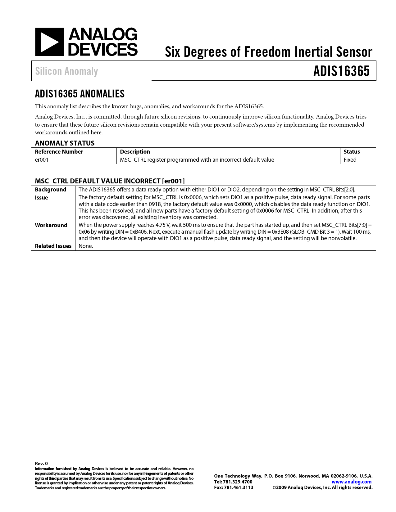 Document Outline ADIS16365 ANOMALIES ANOMALY STATUS MSC_CTRL DEFAULT VALUE INCORRECT [er001]