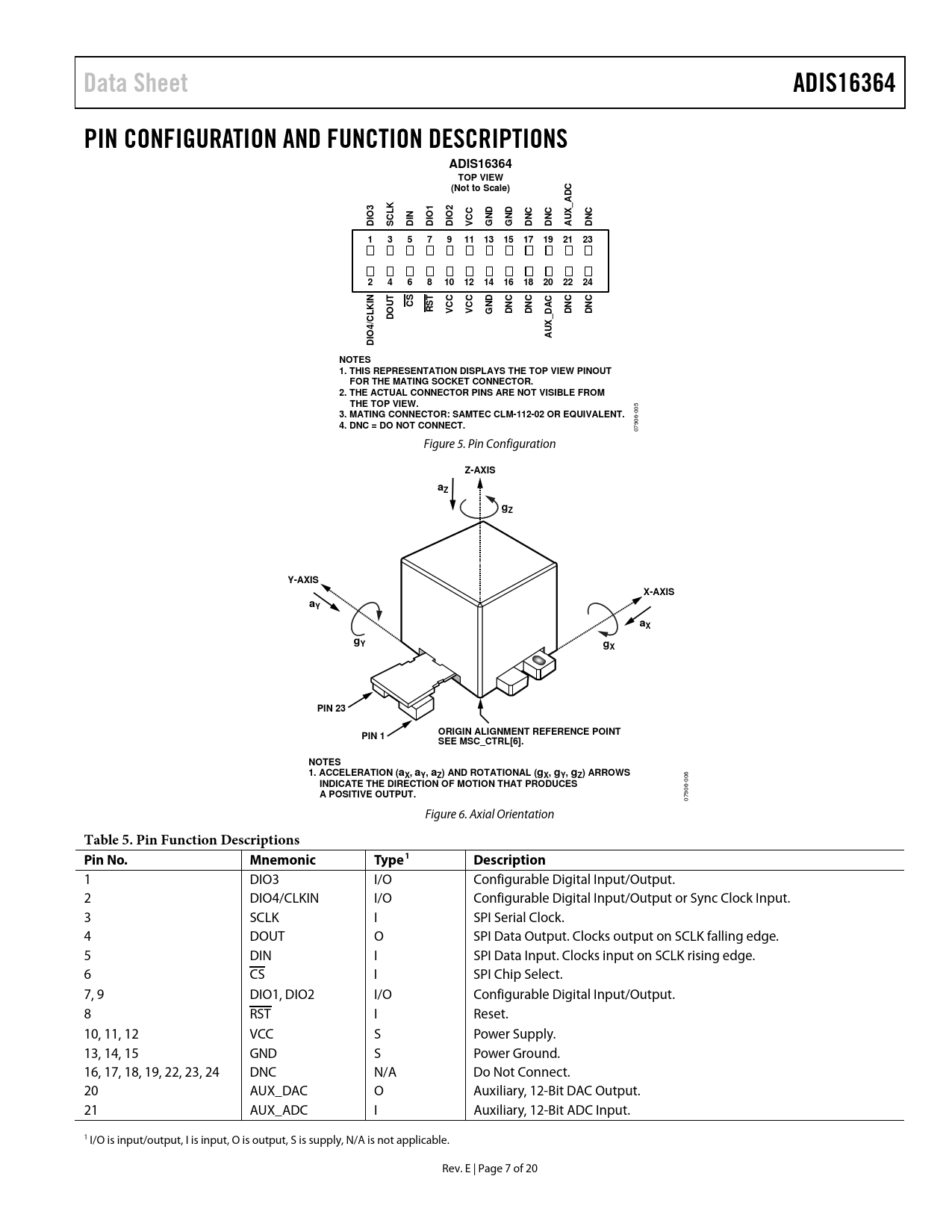 link to page 8 Data SheetADIS16364PIN CONFIGURATION AND FUNCTION DESCRIPTIONSADIS16364TOP VIEW(Not to Scale)K_ADCIO3CLNIO1IO2CCNDNDDSDIDDVGGDNCDNCAUXDNC135791113151719212324681012141618202224INTUTCSCCCCNDLKRSVVGDNCDNCDNCDNCDO_DAC/CIO4AUXDNOTES 1. THIS REPRESENTATION DISPLAYS THE TOP VIEW PINOUTFOR THE MATING SOCKET CONNECTOR.2. THE ACTUAL CONNECTOR PINS ARE NOT VISIBLE FROM THE TOP VIEW. 3. MATING CONNECTOR: SAMTEC CLM-112-02 OR EQUIVALENT. 005 4. DNC = DO NOT CONNECT. 07906- Figure 5. Pin Configuration Z-AXISaZgZY-AXISX-AXISaYaXgYgXPIN 23ORIGIN ALIGNMENT REFERENCE POINTPIN 1SEE MSC_CTRL[6].NOTES 1. ACCELERATION (aX, aY, aZ) AND ROTATIONAL (gX, gY, gZ) ARROWS INDICATE THE DIRECTION OF MOTION THAT PRODUCES 006 A POSITIVE OUTPUT. 07906- Figure 6. Axial Orientation Table 5. Pin Function Descriptions Pin No.MnemonicType1Description 1 DIO3 I/O Configurable Digital Input/Output. 2 DIO4/CLKIN I/O Configurable Digital Input/Output or Sync Clock Input. 3 SCLK I SPI Serial Clock. 4 DOUT O SPI Data Output. Clocks output on SCLK falling edge. 5 DIN I SPI Data Input. Clocks input on SCLK rising edge. 6 CS I SPI Chip Select. 7, 9 DIO1, DIO2 I/O Configurable Digital Input/Output. 8 RST I Reset. 10, 11, 12 VCC S Power Supply. 13, 14, 15 GND S Power Ground. 16, 17, 18, 19, 22, 23, 24 DNC N/A Do Not Connect. 20 AUX_DAC O Auxiliary, 12-Bit DAC Output. 21 AUX_ADC I Auxiliary, 12-Bit ADC Input. 1 I/O is input/output, I is input, O is output, S is supply, N/A is not applicable. Rev. E | Page 7 of 20 Document Outline Features Applications General Description Functional Block Diagram Revision History Specifications Timing Specifications Timing Diagrams Absolute Maximum Ratings ESD Caution Pin Configuration and Function Descriptions Typical Performance Characteristics Theory of Operation Basic Operation Reading Sensor Data Device Configuration Memory Map Burst Read Data Collection Output Data Registers Calibration Manual Bias Calibration Gyroscope Automatic Bias Null Calibration Gyroscope Precision Automatic Bias Null Calibration Restoring Factory Calibration Linear Acceleration Bias Compensation (Gyroscope) Operational Control Global Commands Internal Sample Rate Power Management Sensor Bandwidth Digital Filtering Dynamic Range Input/Output Functions General-Purpose I/O Input Clock Configuration Data Ready I/O Indicator Auxiliary DAC Diagnostics Self-Test Memory Test Status Alarm Registers Product Identification Applications Information Installation/Handling Gyroscope Bias Optimization Input ADC Channel Interface Printed Circuit Board (PCB) Outline Dimensions Ordering Guide
