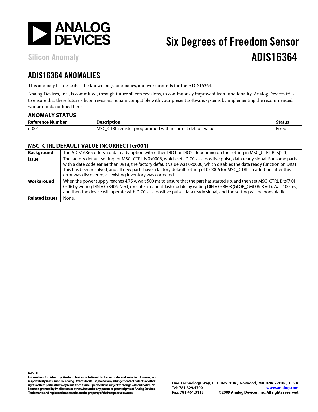 This anomaly list describes the known bugs, anomalies, and workarounds for the ADIS16364. Analog Devices, Inc., is committed, through future silicon revisions, to continuously improve silicon functionality. Analog Devices tries to ensure that these future silicon revisions remain compatible with your present software/systems by implementing the recommended workarounds outlined here.