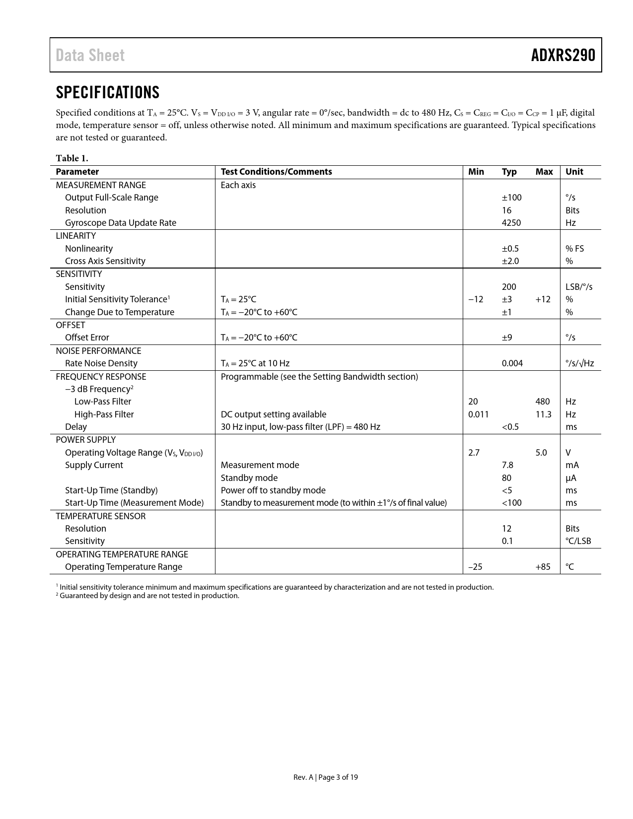 Data Sheet. ADXRS290. SPECIFICATIONS. Table 1. Parameter. Test Conditions/Comments. Min. Typ. Max. Unit