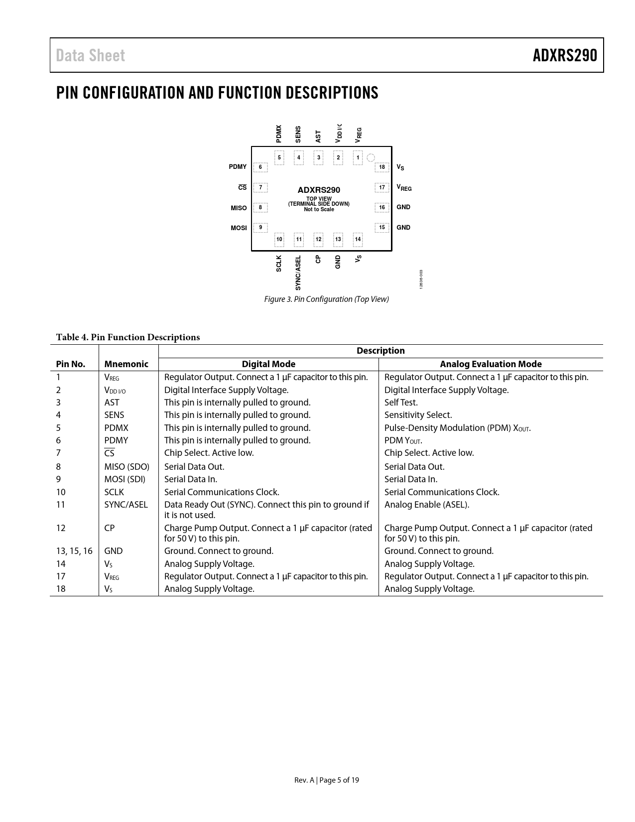 Data Sheet ADXRS290 PIN CONFIGURATION AND FUNCTION DESCRIPTIONS S /O MX T G DD I RE PD SEN AS V V 5 4 3 2 1 PDMY 6 18 VS CS 7 17 VREG ADXRS290 TOP VIEW (TERMINAL SIDE DOWN) MISO 8 16 GND Not to Scale MOSI 9 15 GND 10 11 12 13 14 K S CP ND V CL SEL G S /A C