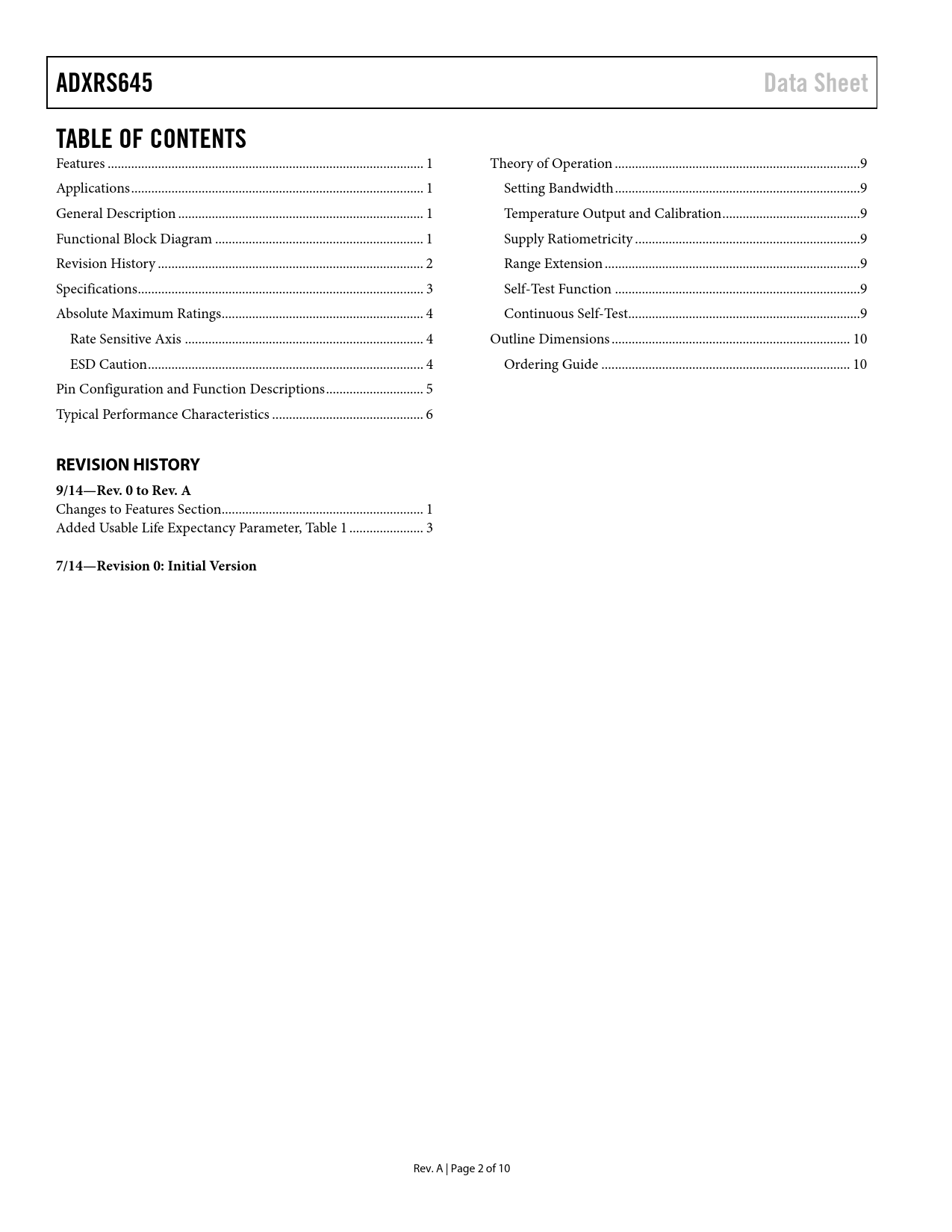 ADXRS645 Data Sheet TABLE OF CONTENTS REVISION HISTORY 9/14—Rev 0 to Rev A 7/14—Revision 0: Initial Version