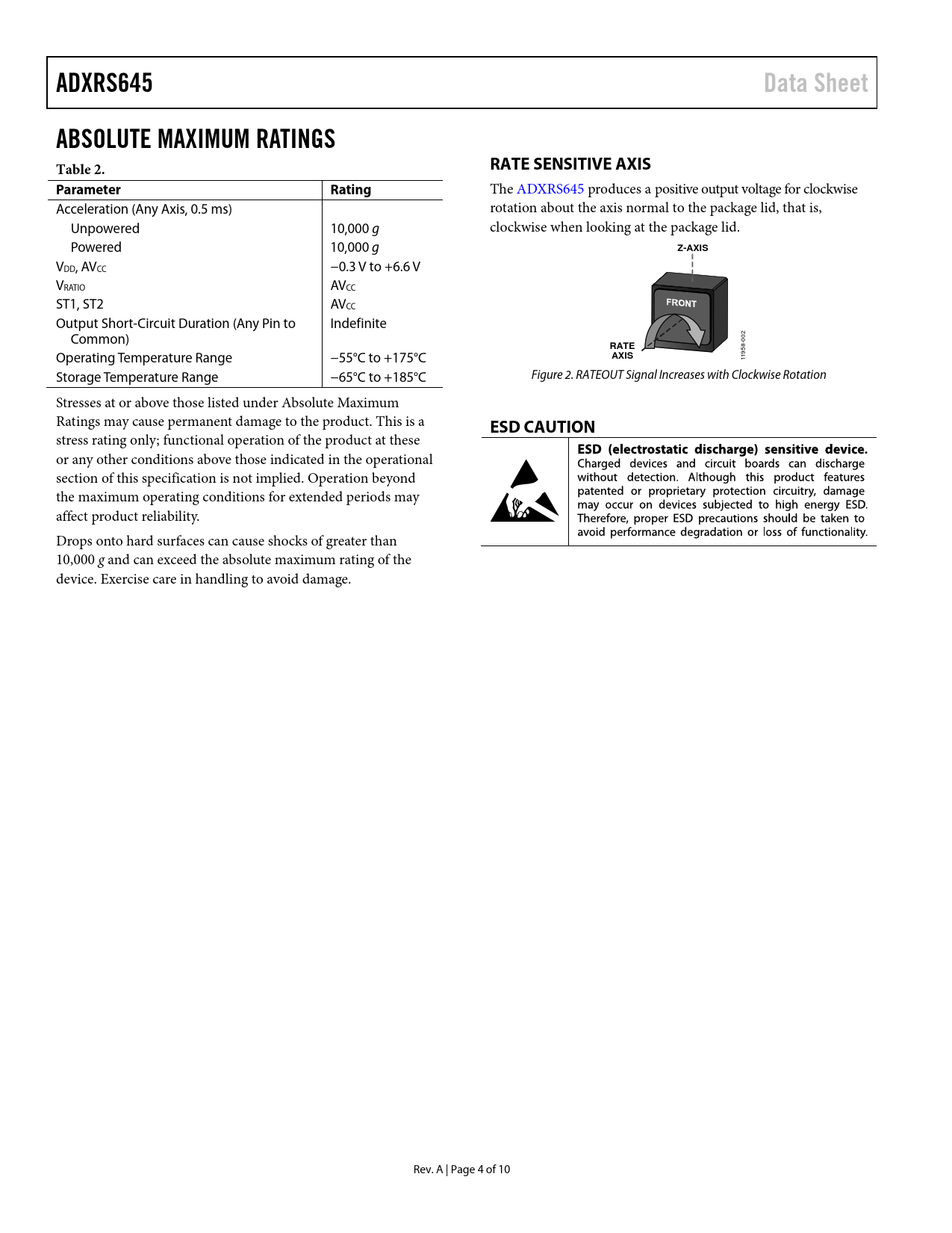 ADXRS645. Data Sheet. ABSOLUTE MAXIMUM RATINGS Table 2. RATE SENSITIVE AXIS. Parameter. Rating. Z-AXIS. RATE. AXIS. ESD CAUTION