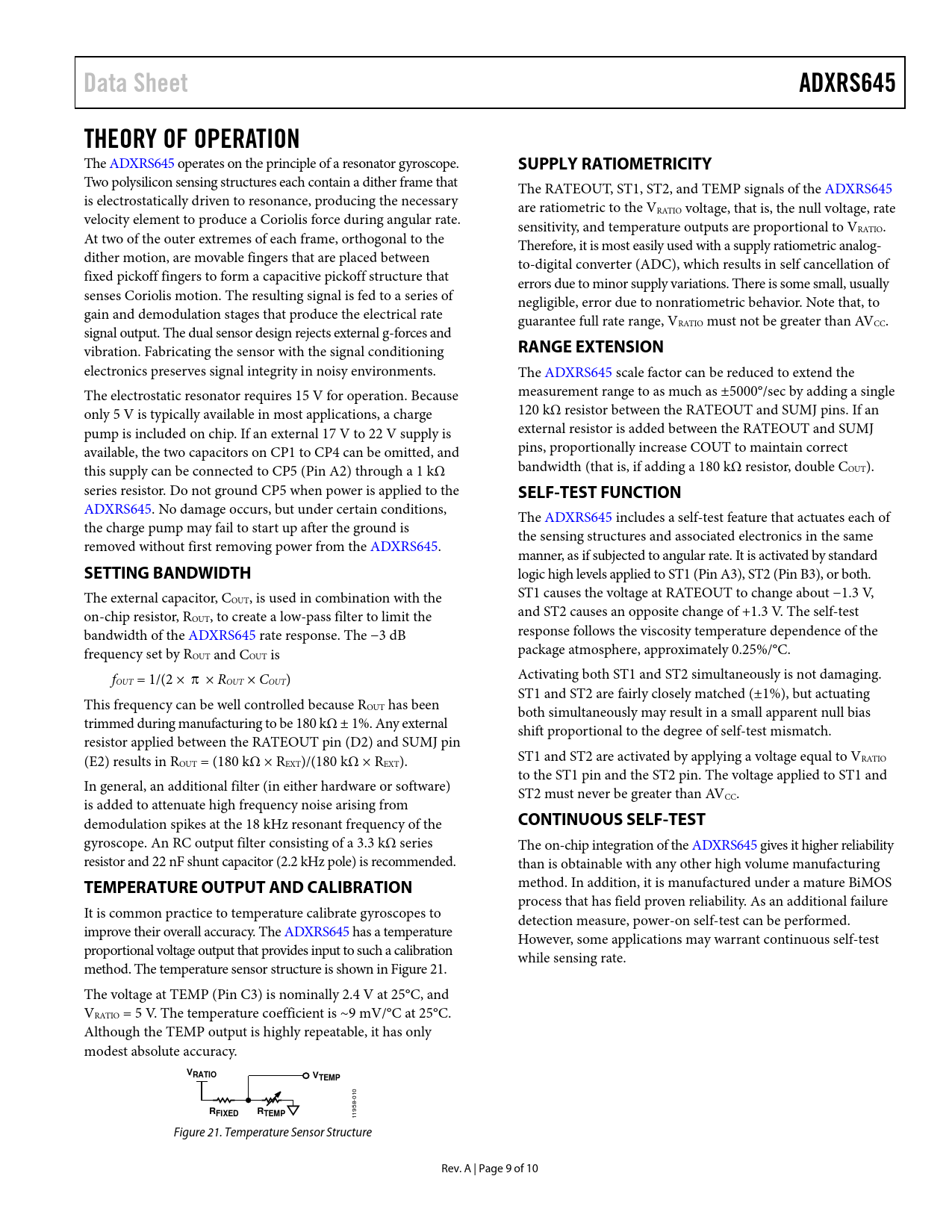 link to page 10 Data SheetADXRS645THEORY OF OPERATION The ADXRS645 operates on the principle of a resonator gyroscope. SUPPLY RATIOMETRICITY Two polysilicon sensing structures each contain a dither frame that The RATEOUT, ST1, ST2, and TEMP signals of the ADXRS645 is electrostatically driven to resonance, producing the necessary are ratiometric to the VRATIO voltage, that is, the null voltage, rate velocity element to produce a Coriolis force during angular rate. sensitivity, and temperature outputs are proportional to V At two of the outer extremes of each frame, orthogonal to the RATIO. Therefore, it is most easily used with a supply ratiometric analog- dither motion, are movable fingers that are placed between to-digital converter (ADC), which results in self cancellation of fixed pickoff fingers to form a capacitive pickoff structure that errors due to minor supply variations. There is some small, usually senses Coriolis motion. The resulting signal is fed to a series of negligible, error due to nonratiometric behavior. Note that, to gain and demodulation stages that produce the electrical rate guarantee full rate range, VRATIO must not be greater than AVCC. signal output. The dual sensor design rejects external g-forces and vibration. Fabricating the sensor with the signal conditioning RANGE EXTENSION electronics preserves signal integrity in noisy environments. The ADXRS645 scale factor can be reduced to extend the The electrostatic resonator requires 15 V for operation. Because measurement range to as much as ±5000°/sec by adding a single only 5 V is typically available in most applications, a charge 120 kΩ resistor between the RATEOUT and SUMJ pins. If an pump is included on chip. If an external 17 V to 22 V supply is external resistor is added between the RATEOUT and SUMJ available, the two capacitors on CP1 to CP4 can be omitted, and pins, proportionally increase COUT to maintain correct this supply can be connected to CP5 (Pin A2) through a 1 kΩ bandwidth (that is, if adding a 180 kΩ resistor, double COUT). series resistor. Do not ground CP5 when power is applied to the SELF-TEST FUNCTION ADXRS645. No damage occurs, but under certain conditions, The ADXRS645 includes a self-test feature that actuates each of the charge pump may fail to start up after the ground is the sensing structures and associated electronics in the same removed without first removing power from the ADXRS645. manner, as if subjected to angular rate. It is activated by standard SETTING BANDWIDTH logic high levels applied to ST1 (Pin A3), ST2 (Pin B3), or both. The external capacitor, C ST1 causes the voltage at RATEOUT to change about −1.3 V, OUT, is used in combination with the on-chip resistor, R and ST2 causes an opposite change of +1.3 V. The self-test OUT, to create a low-pass filter to limit the bandwidth of the ADXRS645 rate response. The −3 dB response fol ows the viscosity temperature dependence of the frequency set by R package atmosphere, approximately 0.25%/°C. OUT and COUT is f Activating both ST1 and ST2 simultaneously is not damaging. OUT = 1/(2 × π × ROUT × COUT) ST1 and ST2 are fairly closely matched (±1%), but actuating This frequency can be well control ed because ROUT has been both simultaneously may result in a small apparent null bias trimmed during manufacturing to be 180 kΩ ± 1%. Any external shift proportional to the degree of self-test mismatch. resistor applied between the RATEOUT pin (D2) and SUMJ pin (E2) results in R ST1 and ST2 are activated by applying a voltage equal to V OUT = (180 kΩ × REXT)/(180 kΩ × REXT). RATIO to the ST1 pin and the ST2 pin. The voltage applied to ST1 and In general, an additional filter (in either hardware or software) ST2 must never be greater than AV is added to attenuate high frequency noise arising from CC. demodulation spikes at the 18 kHz resonant frequency of the CONTINUOUS SELF-TEST gyroscope. An RC output filter consisting of a 3.3 kΩ series The on-chip integration of the ADXRS645 gives it higher reliability resistor and 22 nF shunt capacitor (2.2 kHz pole) is recommended. than is obtainable with any other high volume manufacturing TEMPERATURE OUTPUT AND CALIBRATION method. In addition, it is manufactured under a mature BiMOS process that has field proven reliability. As an additional failure It is common practice to temperature calibrate gyroscopes to detection measure, power-on self-test can be performed. improve their overall accuracy. The ADXRS645 has a temperature However, some applications may warrant continuous self-test proportional voltage output that provides input to such a calibration while sensing rate. method. The temperature sensor structure is shown in Figure 21. The voltage at TEMP (Pin C3) is nominal y 2.4 V at 25°C, and V RATIO = 5 V. The temperature coefficient is ~9 mV/°C at 25°C. Although the TEMP output is highly repeatable, it has only modest absolute accuracy. VRATIOVTEMP 010 RFIXEDRTEMP 1958- 1 Figure 21. Temperature Sensor Structure Rev. A | Page 9 of 10 Document Outline Features Applications General Description Functional Block Diagram Table of Contents Revision History Specifications Absolute Maximum Ratings Rate Sensitive Axis ESD Caution Pin Configuration and Function Descriptions Typical Performance Characteristics Theory of Operation Setting Bandwidth Temperature Output and Calibration Supply Ratiometricity Range Extension Self-Test Function Continuous Self-Test Outline Dimensions Ordering Guide
