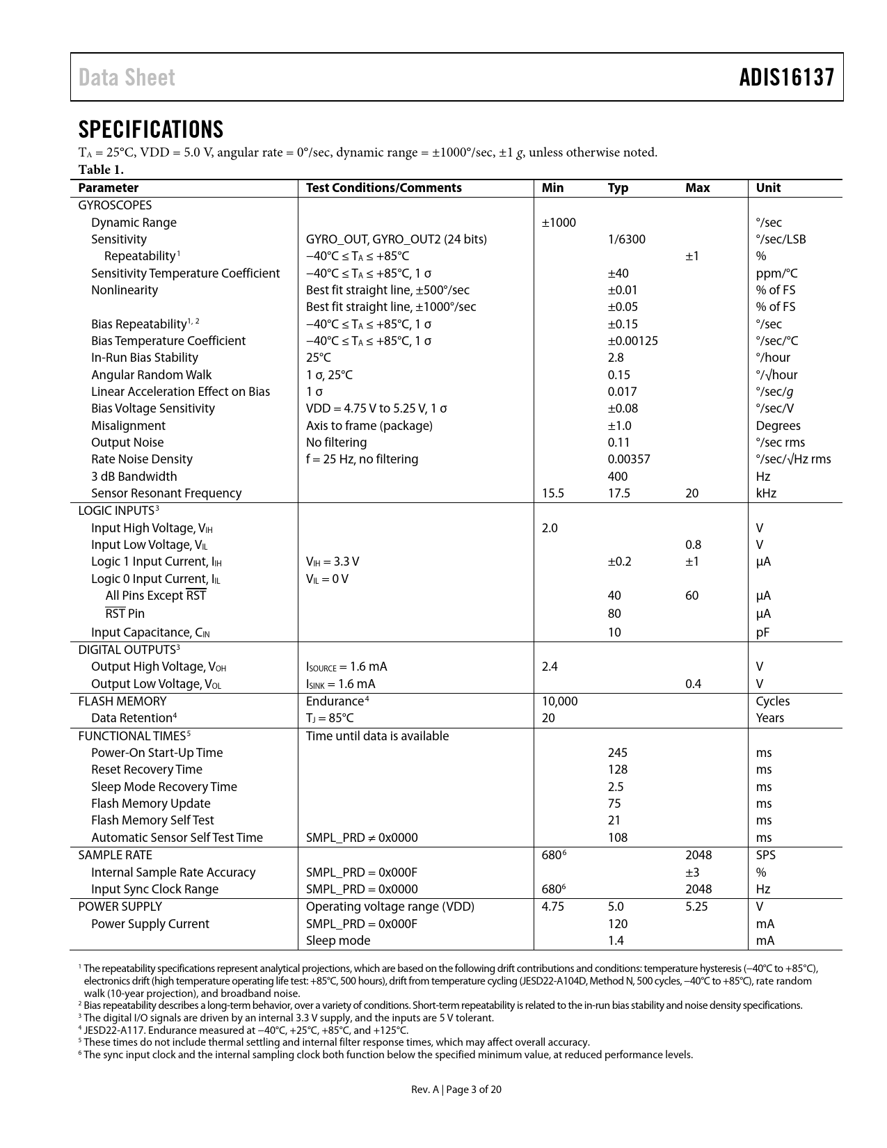 Data Sheet ADIS16137 SPECIFICATIONS Table 1 Parameter Test Conditions/Comments Min Typ Max Unit