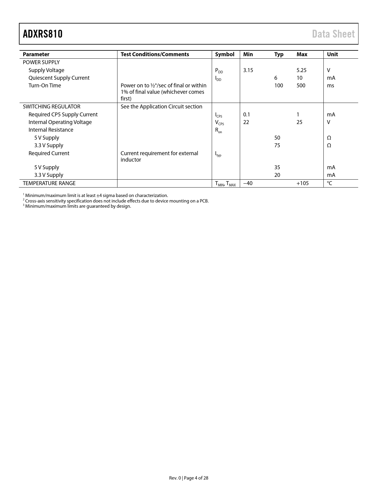 link to page 11 ADXRS810Data SheetParameterTest Conditions/CommentsSymbolMinTypMaxUnit POWER SUPPLY Supply Voltage P 3.15 5.25 V DD Quiescent Supply Current I 6 10 mA DD Turn-On Time Power on to ½°/sec of final or within 100 500 ms 1% of final value (whichever comes first) SWITCHING REGULATOR See the Application Circuit section Required CP5 Supply Current I 0.1 1 mA CP5 Internal Operating Voltage V 22 25 V CP5 Internal Resistance R on 5 V Supply 50 Ω 3.3 V Supply 75 Ω Required Current Current requirement for external I typ inductor 5 V Supply 35 mA 3.3 V Supply 20 mA TEMPERATURE RANGE T , T −40 +105 °C MIN MAX 1 Minimum/maximum limit is at least ±4 sigma based on characterization. 2 Cross-axis sensitivity specification does not include effects due to device mounting on a PCB. 3 Minimum/maximum limits are guaranteed by design. Rev. 0 | Page 4 of 28 Document Outline Features Applications General Description Functional Block Diagram Revision History Specifications Absolute Maximum Ratings Thermal Resistance Rate Sensitive Axis ESD Caution Pin Configurations and Function Descriptions Typical Performance Characteristics Theory of Operation Continuous Self-Test Applications Information Calibrated Performance Mechanical Considerations for Mounting Application Circuit ADXRS810 Signal Chain Timing SPI Communications Characteristics SPI Communication Protocol—Applications Device Data Latching Command/Response SPI Communication Protocol—Bit Definitions Command/Response Bit Descriptions ADXRS810 Fault Register Bit Definitions CHK Bit Assertion: Recommended Start-Up Routine SPI Rate Data Format ADXRS810 Memory Map Memory Register Definitions 0x00 RATE1, 0x01 RATE0 0x02 TEM1, 0x03 TEM0 0x04 LOCST1, 0x05 LOCST0 0x06 HICST1, 0x07 HICST0 0x08 QUAD1, 0x09 QUAD0 0x0A FAULT1, 0x0B FAULT0 0x0C PID1, 0x0D PID0 0x0E SN3, 0x0F SN2, 0x10 SN1, 0x11 SN0 Suggested PCB Layout Solder Profile Package Marking Codes Outline Dimensions Ordering Guide Automotive Products