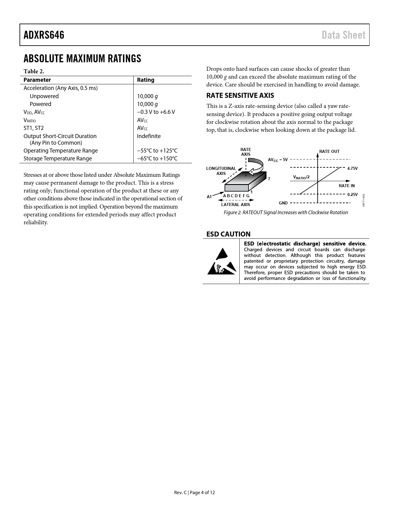 ADXRS646Data SheetABSOLUTE MAXIMUM RATINGS Table 2. Drops onto hard surfaces can cause shocks of greater than 10,000 g and can exceed the absolute maximum rating of the Parameter Rating device. Care should be exercised in handling to avoid damage. Acceleration (Any Axis, 0.5 ms) Unpowered 10,000 g RATE SENSITIVE AXIS Powered 10,000 g This is a Z-axis rate-sensing device (also called a yaw rate- VDD, AVCC −0.3 V to +6.6 V sensing device). It produces a positive going output voltage VRATIO AVCC for clockwise rotation about the axis normal to the package ST1, ST2 AVCC top, that is, clockwise when looking down at the package lid. Output Short-Circuit Duration Indefinite (Any Pin to Common) Operating Temperature Range −55°C to +125°C RATERATE OUTAXIS Storage Temperature Range −65°C to +150°C AVCC = 5VLONGITUDINAL4.75V+ Stresses at or above those listed under Absolute Maximum Ratings AXIS7VRATIO/2 may cause permanent damage to the product. This is a stress RATE IN rating only; functional operation of the product at these or any 1A1A B C D E F G0.25V other conditions above those indicated in the operational section of 002 1- GND this specification is not implied. Operation beyond the maximum LATERAL AXIS 977 0 operating conditions for extended periods may affect product Figure 2. RATEOUT Signal Increases with Clockwise Rotation reliability. ESD CAUTION Rev. C | Page 4 of 12 Document Outline FEATURES APPLICATIONS GENERAL DESCRIPTION FUNCTIONAL BLOCK DIAGRAM TABLE OF CONTENTS REVISION HISTORY SPECIFICATIONS ABSOLUTE MAXIMUM RATINGS RATE SENSITIVE AXIS ESD CAUTION PIN CONFIGURATION AND FUNCTION DESCRIPTIONS TYPICAL PERFORMANCE CHARACTERISTICS THEORY OF OPERATION SETTING BANDWIDTH TEMPERATURE OUTPUT AND CALIBRATION SUPPLY RATIOMETRICITY NULL ADJUSTMENT SELF-TEST FUNCTION CONTINUOUS SELF-TEST MODIFYING THE MEASUREMENT RANGE IMMUNITY TO VIBRATION OUTLINE DIMENSIONS ORDERING GUIDE