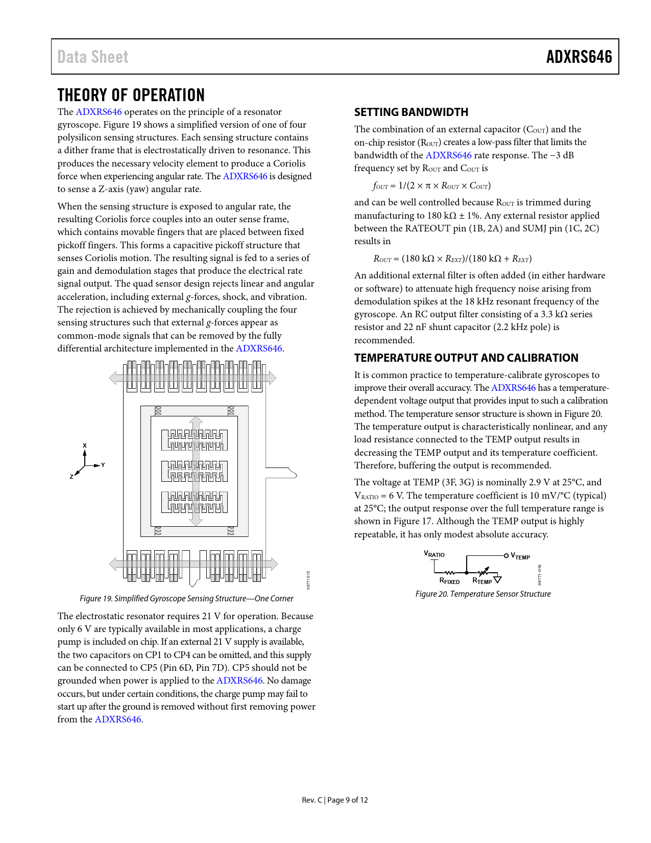 link to page 10 link to page 10 link to page 9 Data SheetADXRS646THEORY OF OPERATION The ADXRS646 operates on the principle of a resonator SETTING BANDWIDTH gyroscope. Figure 19 shows a simplified version of one of four The combination of an external capacitor (COUT) and the polysilicon sensing structures. Each sensing structure contains on-chip resistor (ROUT) creates a low-pass filter that limits the a dither frame that is electrostatically driven to resonance. This bandwidth of the ADXRS646 rate response. The −3 dB produces the necessary velocity element to produce a Coriolis frequency set by ROUT and COUT is force when experiencing angular rate. The ADXRS646 is designed to sense a Z-axis (yaw) angular rate. fOUT = 1/(2 × π × ROUT × COUT) When the sensing structure is exposed to angular rate, the and can be well controlled because ROUT is trimmed during resulting Coriolis force couples into an outer sense frame, manufacturing to 180 kΩ ± 1%. Any external resistor applied which contains movable fingers that are placed between fixed between the RATEOUT pin (1B, 2A) and SUMJ pin (1C, 2C) pickoff fingers. This forms a capacitive pickoff structure that results in senses Coriolis motion. The resulting signal is fed to a series of ROUT = (180 kΩ × REXT)/(180 kΩ + REXT) gain and demodulation stages that produce the electrical rate An additional external filter is often added (in either hardware signal output. The quad sensor design rejects linear and angular or software) to attenuate high frequency noise arising from acceleration, including external g-forces, shock, and vibration. demodulation spikes at the 18 kHz resonant frequency of the The rejection is achieved by mechanically coupling the four gyroscope. An RC output filter consisting of a 3.3 kΩ series sensing structures such that external g-forces appear as resistor and 22 nF shunt capacitor (2.2 kHz pole) is common-mode signals that can be removed by the fully recommended. differential architecture implemented in the ADXRS646. TEMPERATURE OUTPUT AND CALIBRATION It is common practice to temperature-calibrate gyroscopes to improve their overall accuracy. The ADXRS646 has a temperature- dependent voltage output that provides input to such a calibration method. The temperature sensor structure is shown in Figure 20. The temperature output is characteristically nonlinear, and any load resistance connected to the TEMP output results in X decreasing the TEMP output and its temperature coefficient. Y Therefore, buffering the output is recommended. Z The voltage at TEMP (3F, 3G) is nominally 2.9 V at 25°C, and VRATIO = 6 V. The temperature coefficient is 10 mV/°C (typical) at 25°C; the output response over the full temperature range is shown in Figure 17. Although the TEMP output is highly repeatable, it has only modest absolute accuracy. VRATIOVTEMP 16 0 15 1- 0 1- RFIXEDRTEMP 0977 977 0 Figure 20. Temperature Sensor Structure Figure 19. Simplified Gyroscope Sensing Structure—One Corner The electrostatic resonator requires 21 V for operation. Because only 6 V are typically available in most applications, a charge pump is included on chip. If an external 21 V supply is available, the two capacitors on CP1 to CP4 can be omitted, and this supply can be connected to CP5 (Pin 6D, Pin 7D). CP5 should not be grounded when power is applied to the ADXRS646. No damage occurs, but under certain conditions, the charge pump may fail to start up after the ground is removed without first removing power from the ADXRS646. Rev. C | Page 9 of 12 Document Outline FEATURES APPLICATIONS GENERAL DESCRIPTION FUNCTIONAL BLOCK DIAGRAM TABLE OF CONTENTS REVISION HISTORY SPECIFICATIONS ABSOLUTE MAXIMUM RATINGS RATE SENSITIVE AXIS ESD CAUTION PIN CONFIGURATION AND FUNCTION DESCRIPTIONS TYPICAL PERFORMANCE CHARACTERISTICS THEORY OF OPERATION SETTING BANDWIDTH TEMPERATURE OUTPUT AND CALIBRATION SUPPLY RATIOMETRICITY NULL ADJUSTMENT SELF-TEST FUNCTION CONTINUOUS SELF-TEST MODIFYING THE MEASUREMENT RANGE IMMUNITY TO VIBRATION OUTLINE DIMENSIONS ORDERING GUIDE
