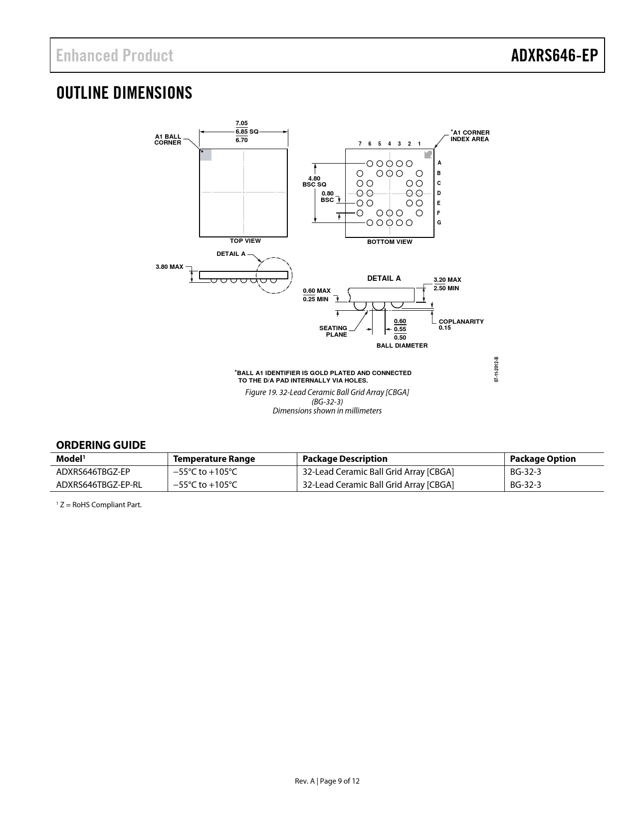Enhanced Product ADXRS646-EP OUTLINE DIMENSIONS 7.05 6.85 SQ *A1 CORNER A1 BALL 6.70 INDEX AREA CORNER 7 6 5 4 3 2 1 A B 4.80 C BSC SQ 0.80 D BSC E F G TOP VIEW BOTTOM VIEW DETAIL A 3.80 MAX DETAIL A 3.20 MAX 0.60 MAX 2.50 MIN 0.25 MIN 0.60 COPLANARITY SEATING 0.55 0.15 PLANE 0.50 BALL DIAMETER B 12- *BALL A1 IDENTIFIER IS GOLD PLATED AND CONNECTED -20 1 1 TO THE D/A PAD INTERNALLY VIA HOLES. 7- 0