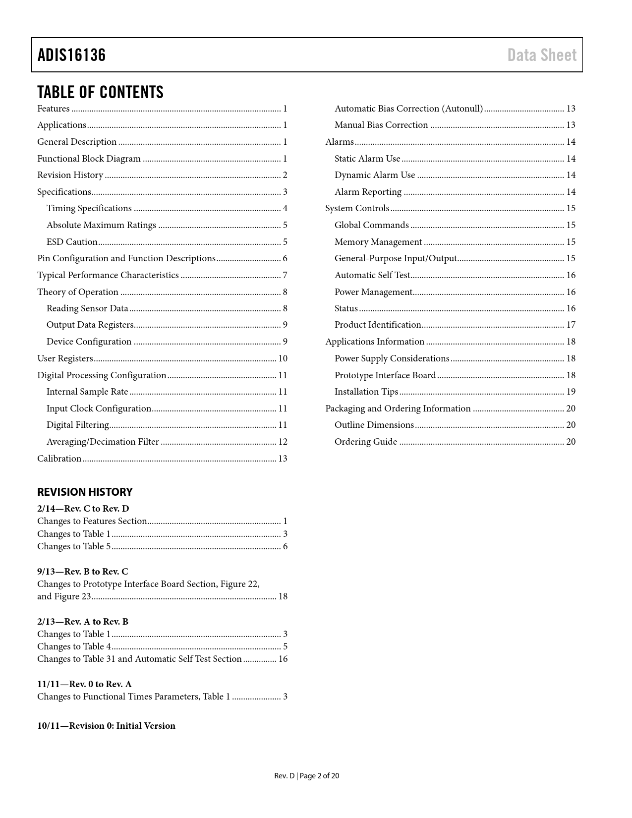 ADIS16136 Data Sheet TABLE OF CONTENTS REVISION HISTORY 2/14—Rev C to Rev D 9/13—Rev B to Rev C 2/13—Rev A to Rev B